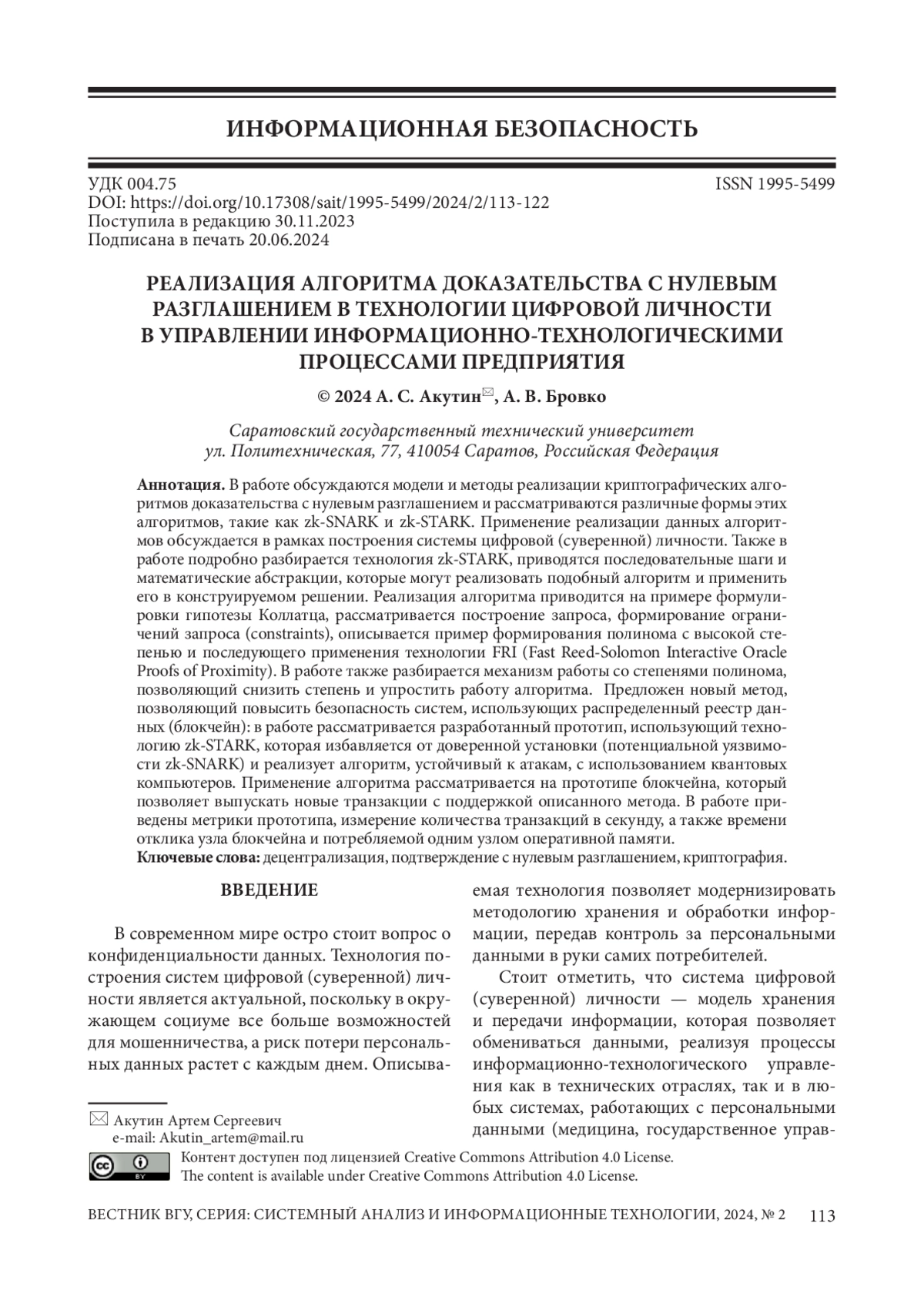 В работе обсуждаются модели и методы реализации криптографических алгоритмов доказательства с нулевым разглашением и рассматриваются различные формы этих алгоритмов, такие как zk-SNARK и zk-STARK. Применение реализации данных алгоритмов обсуждается в рамках построения системы цифровой (суверенной) личности. Также в работе подробно разбирается технология zk-STARK, приводятся последовательные шаги и математические абстракции, которые могут реализовать подобный алгоритм и применить его в конструируемом решении. Реализация алгоритма приводится на примере формулировки гипотезы Коллатца, рассматривается построение запроса, формирование ограничений запроса (constraints), описывается пример формирования полинома с высокой степенью и последующего применения технологии FRI (Fast Reed-Solomon Interactive Oracle Proofs of Proximity). В работе также разбирается механизм работы со степенями полинома, позволяющий снизить степень и упростить работу алгоритма. Предложен новый метод, позволяющий повысить безопасность систем, использующих распределенный реестр данных (блокчейн): в работе рассматривается разработанный прототип, использующий технологию zk-STARK, которая избавляется от доверенной установки (потенциальной уязвимости zk-SNARK) и реализует алгоритм, устойчивый к атакам, с использованием квантовых компьютеров. Применение алгоритма рассматривается на прототипе блокчейна, который позволяет выпускать новые транзакции с поддержкой описанного метода. В работе приведены метрики прототипа, измерение количества транзакций в секунду, а также времени отклика узла блокчейна и потребляемой одним узлом оперативной памяти.