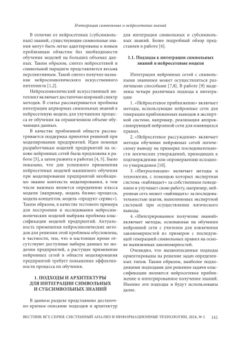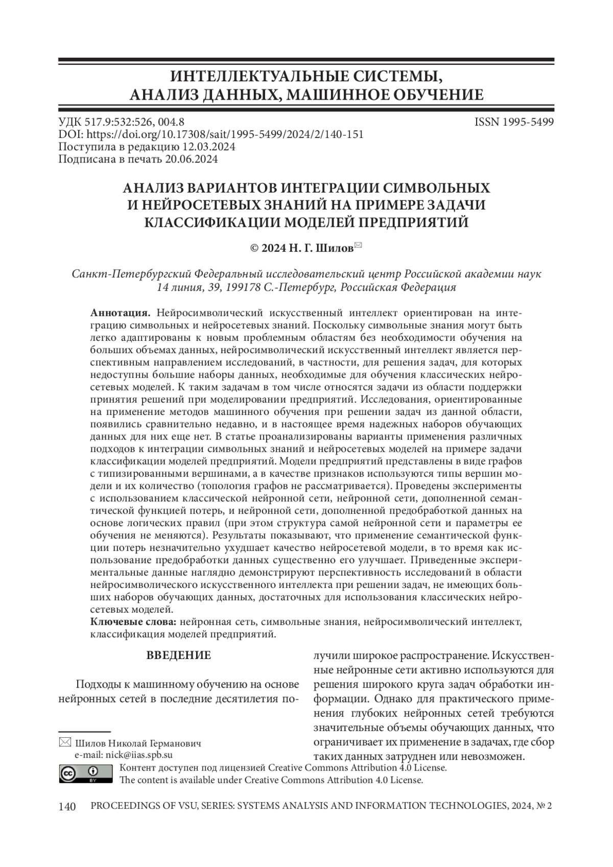 ШИЛОВ Н. Г. АНАЛИЗ ВАРИАНТОВ ИНТЕГРАЦИИ СИМВОЛЬНЫХ И НЕЙРОСЕТЕВЫХ ЗНАНИЙ НА ПРИМЕРЕ ЗАДАЧИ КЛАССИФИКАЦИИ МОДЕЛЕЙ ПРЕДПРИЯТИЙ // ВЕСТНИК ВОРОНЕЖСКОГО ГОСУДАРСТВЕННОГО УНИВЕРСИТЕТА. СЕРИЯ: СИСТЕМНЫЙ АНАЛИЗ И ИНФОРМАЦИОННЫЕ ТЕХНОЛОГИИ. 2024. № 2
