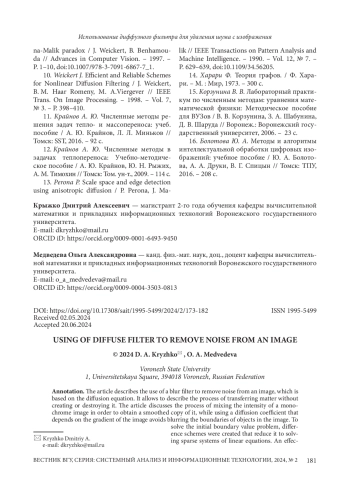 КРЫЖКО Д. А., МЕДВЕДЕВА О. А. ИСПОЛЬЗОВАНИЕ ДИФФУЗНОГО ФИЛЬТРА ДЛЯ УДАЛЕНИЯ ШУМА С ИЗОБРАЖЕНИЯ // ВЕСТНИК ВОРОНЕЖСКОГО ГОСУДАРСТВЕННОГО УНИВЕРСИТЕТА. СЕРИЯ: СИСТЕМНЫЙ АНАЛИЗ И ИНФОРМАЦИОННЫЕ ТЕХНОЛОГИИ. 2024. № 2
