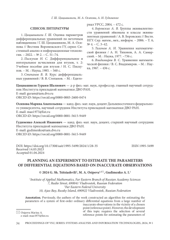 1. Цициашвили Г. Ш. Оценка параметров дифференциальных уравнений по неточным наблюдениям / Г. Ш. Цициашвили, М. А. Осипова // Вестник Воронежского ГУ серия: Системный анализ и информационные технологии. - 2022. - № 2. - С. 51-74.