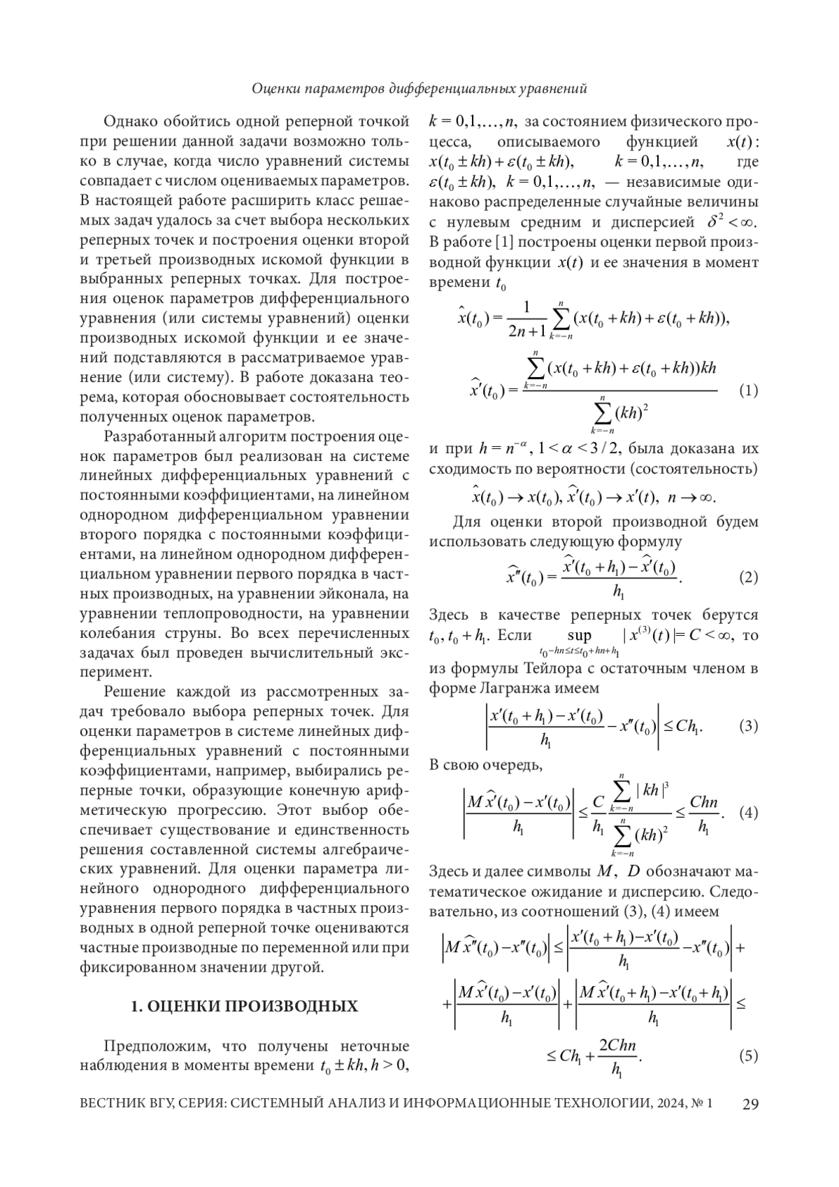 Ранее авторами работы был построен алгоритм оценки параметров системы обыкновенных дифференциальных уравнений первого порядка по большому числу неточных наблюдений в окрестности выбранной точки (реперной точки). Однако развитие этой тематики требует выбора нескольких реперных точек для оценивания параметров системы дифференциальных уравнений и построения оценок для производных более высокого порядка. При этом число оцениваемых параметров может быть больше числа уравнений. В настоящей работе строится алгоритм оценивания второй и третьей производных. Он основан на построенной ранее оценке первой производной по неточным наблюдениям и конечно разностной формуле для производной первого порядка. Доказана состоятельность оценки второй производной при определенных условиях, накладываемых на выбор точек наблюдения. Построенный алгоритм был применен для обыкновенных дифференциальных уравнений первого и второго порядка, для систем дифференциальных уравнений первого порядка, для дифференциальных уравнений первого и второго порядка в частных производных. При решении этих задач выбирались реперные точки, в окрестности которых производились наблюдения по разным осям, и строились оценки параметров рассматриваемых уравнений на основе оценок их производных в выбранных точках. Проведены вычислительные эксперименты, показывающие качество построенных оценок. Наиболее сложным оказался выбор реперных точек при оценке элементов матрицы в системе обыкновенных дифференциальных уравнений первого порядка. Если реперные точки образуют арифметическую последовательность, то удалось построить матричное соотношение для оценки матрицы коэффициентов рассматриваемого уравнения, которое имеет единственное решение, что доказано на основе неравенства нулю определителя Вандермонда.