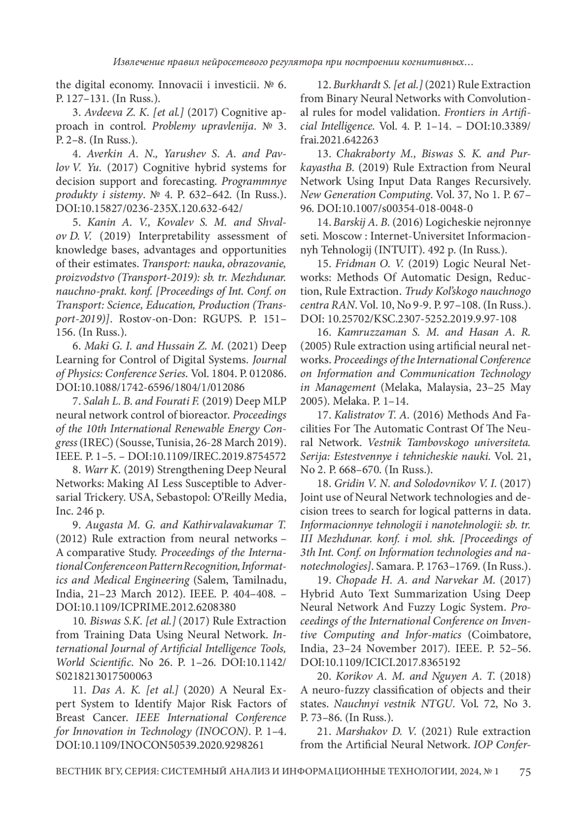 Когнитивные технологии входят в один из самых «интеллектуальных» разделов теории искусственного интеллекта. Особое место в интеллектуальных системах занимает обучение по прецедентам, основанное на выявлении общих закономерностей по частным эмпирическим данным, реализуемое главным образом в искусственных нейронных сетях (ИНС). Благодаря своим структурным особенностям, ИНС успешно применяются для синтеза нелинейных регуляторов в автоматических системах управления, однако неявный для пользователя нейросетевой алгоритм формирования результатов порождает проблему доверия к его выводам при решении реальных практических задач, в связи с чем актуальна задача установления «прозрачности» внутреннего алгоритма ИНС. Целью исследования является повышение достоверности функционирования нейро-сетевых регуляторов при построении когнитивных систем автоматического управления. В работе выполнен анализ существующих подходов и методов интерпретируемости результатов ИНС, рассмотрены известные способы формализации нейросетевых алгоритмов, позволяющие выполнить описание правил функционирования ИНС. Предложена методика извлечения правил нейросетевого регулятора на основе гранулярных вычислений, где в качестве информационных гранул принимаются множества схожих по своим свойствам входных признаков, объединенных в кластеры, что достигается путем интеграции в слои многослойных ИНС самоорганизующихся слоев. Применимость предложенных решений показана на примере синтеза системы автоматического регулирования, имеющей нелинейные характеристики. Выполнено построение нейросетевого регулятора, превосходящего по своим характеристикам известные решения данной задачи, а также обладающего возможностью вербального представления правил своего функционирования. Практической значимостью предложенных решений является построение причинно-следственной связи между наборами входных данных и формируемым выходным сигналом нейросетевого регулятора, их представлением в виде совокупности правил, обеспечивающих интерпретацию нейросетевого алгоритма в аспекте построения когнитивной системы автоматического управления. Предложенная методика извлечения правил нейросетевого регулятора может найти применение в методах анализа и синтеза интеллектуальных систем автоматического управления, о чем даны соответствующие рекомендации и предложения.