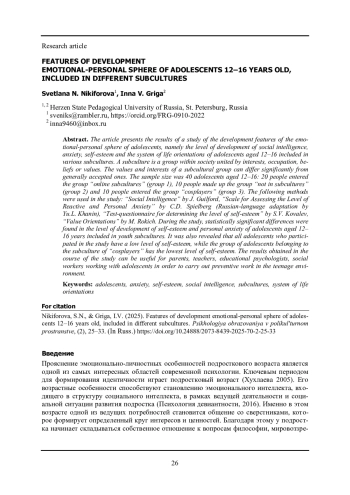 В статье представлены результаты исследования особенностей развития эмоционально- личностной сферы подростков, а именно уровень развития социального интеллекта, тревожности, уровня самооценки и системы жизненных ориентаций подростков 12-16 лет включенных в различные субкультуры. Субкультура - это группа внутри общества, объединенная интересами, родом занятий, убеждениями или ценностями. Ценности и интересы субкультурной группы могут заметно отличаться от общепринятых. Объем выборки составили 40 подростков в возрасте 12-16 лет: 20 человек вошли в группу «онлайн субкультуры» (группа 1), 10 человек составили группу «не в субкультурах» (группа 2) и 10 человек вошли в группу косплееров (группа 3). В исследовании использовались методики: «Социальный интеллект» Дж. Гилфорда, «Шкала оценки уровня реактивной и личностной тревожности» Ч. Д. Спилбергерга (русскоязычная адаптация Ю. Л. Ханина), «Тест-опросник для определения уровня самооценки» С. В. Ковалева, «Ценностные ориентации» М. Рокича. В ходе исследования были обнаружены статистически значимые различия в уровне развития самооценки и личностной тревожности подростков 12-16 лет, включенных в молодежные субкультуры. Так же было выявлено что у всех подростков, принимавших участие в исследовании, преобладает низкий уровень самооценки, при этом в группе подростков, относящихся к субкультуре косплеееров, отмечается самый низкий уровень самооценки. Результаты, полученные в ходе исследования, могут быть полезны родителям, педагогам, педагогам-психологам, социальным педагогам работающими с подростками с целью проведения профилактической работы в подростковой среде.