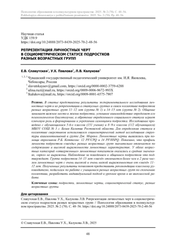 В статье представлены результаты экспериментального исследования личностных черт и их репрезентации в статусных группах в своем коллективе подростков разных возрастных групп 11-12 лет (группа № 1) и 14-15 лет (группа № 2). Общение занимает важное место в жизни подростка, успешное взаимодействие определяет его психологическое благополучие, а обретение определенного социального статуса играет ключевую роль в формировании и укреплении самооценки подростка. Исследование проведено с обучающимися 5-6-х классов (151 ученик) и 8-9-х классов (112 обучающихся) МБОУ СОШ № 3 г. Белая Калитва Ростовской области. Для определения статуса в коллективе сверстников использовался социометрический метод исследования структуры взаимоотношений в группе Дж. Морено. Личностные черты выявлялись при помощи опросников Р. Б. Кеттелла: 12 PF/CPQ и 14 PF/HSPQ. Показано, что профиль личности подростков «звезды» разных возрастных групп значительно отличается по содержанию и высокой выраженности личностных характеристик. У обеих возрастных категорий «отверженные» личностные показатели оказались в средних значениях, «ярко» не выражены. Наблюдение за поведением и общением подростков это подтверждает. Группа подростков 14-15 лет «звезд» отличается более чем в 2 раза числом личностных черт с очень высокой и очень низкой выраженностью от «звезд» 11-12 лет. Полученные результаты позволяют предоставить рекомендации классному руководителю, педагогам по работе с учащимися разных возрастных групп по сплочению коллектива, разработать индивидуальный подход в урочное время и во внеклассной работе.
