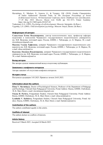 19. Slavutskaya E., Nikolaev E., Ivanova G., Yusupov I.M. Gender Characteristics of Junior Adolescents’ Personal Traits // The European Proceedings of Social & Behavioural Sciences EpSBS: ECCE 2018 VII International Conference Early Childhood Care and Education. 17-20 May 2018, Moscow, Russia. Future Academy, 2018. Vol. XLIII. Pp. 522-527.