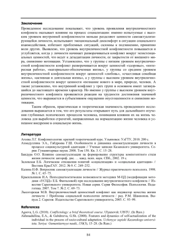 7. Лысогорская М.В. Внутриличностный ценностный конфликт как индикатор качества жизни личности // Проблемы социальной психологии личности / ред. Р.М. Шамионов. Выпуск 2. Саратов: Издательство Саратовского университета, 2005. С. 93-99.
