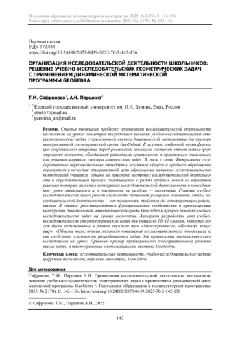 САФРОНОВА Т. М., ПАРШИНА А. Н. ОРГАНИЗАЦИЯ ИССЛЕДОВАТЕЛЬСКОЙ ДЕЯТЕЛЬНОСТИ ШКОЛЬНИКОВ: РЕШЕНИЕ УЧЕБНО-ИССЛЕДОВАТЕЛЬСКИХ ГЕОМЕТРИЧЕСКИХ ЗАДАЧ С ПРИМЕНЕНИЕМ ДИНАМИЧЕСКОЙ МАТЕМАТИЧЕСКОЙ ПРОГРАММЫ GEOGEBRA // ПСИХОЛОГИЯ ОБРАЗОВАНИЯ В ПОЛИКУЛЬТУРНОМ ПРОСТРАНСТВЕ. 2025. № 2 (70)