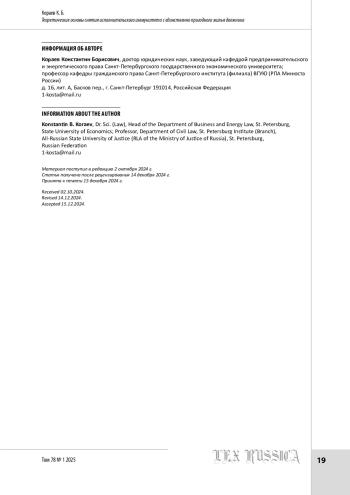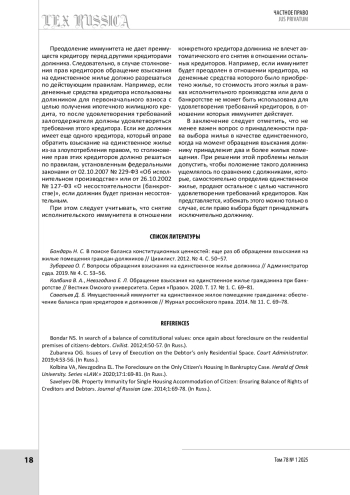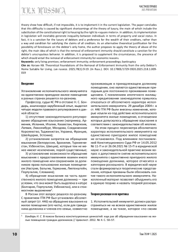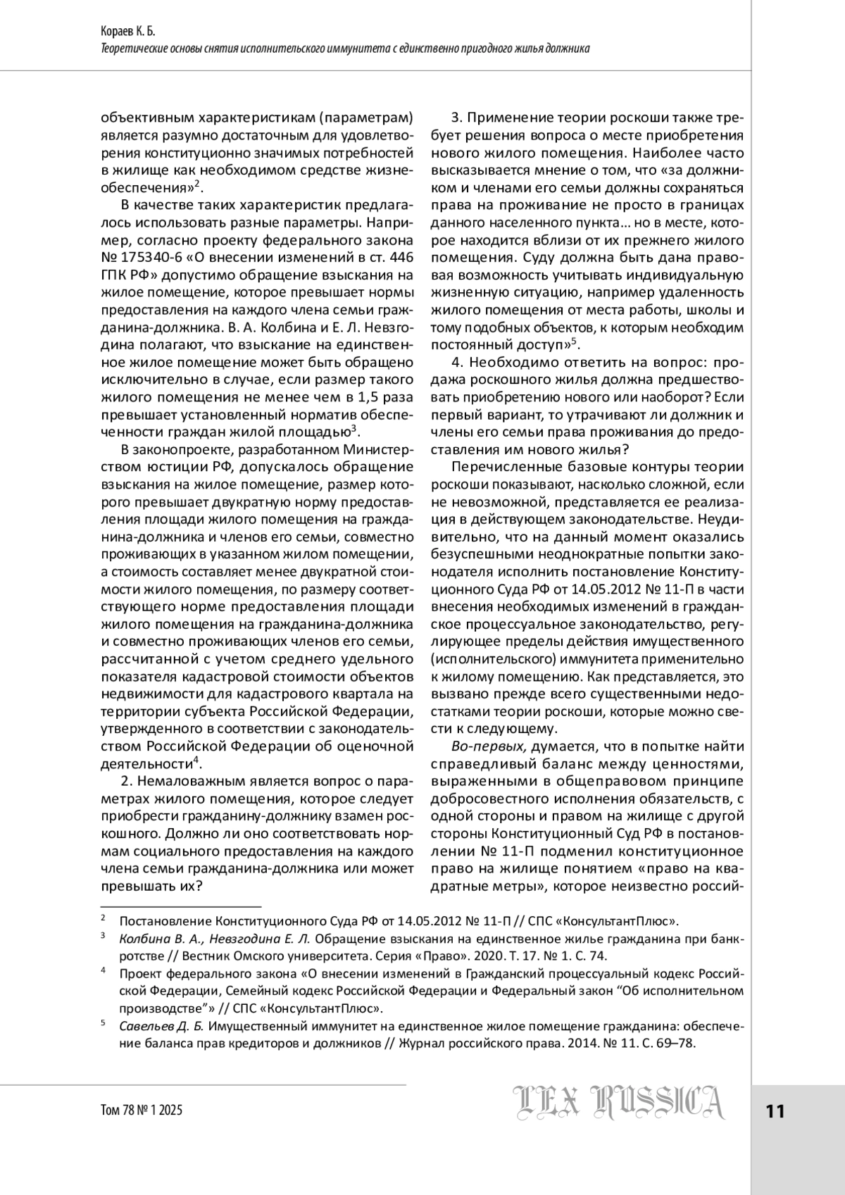 КОРАЕВ К. Б. ТЕОРЕТИЧЕСКИЕ ОСНОВЫ СНЯТИЯ ИСПОЛНИТЕЛЬСКОГО ИММУНИТЕТА С ЕДИНСТВЕННО ПРИГОДНОГО ЖИЛЬЯ ДОЛЖНИКА // LEX RUSSICA (РУССКИЙ ЗАКОН). 2025. ТОМ 78, № 1