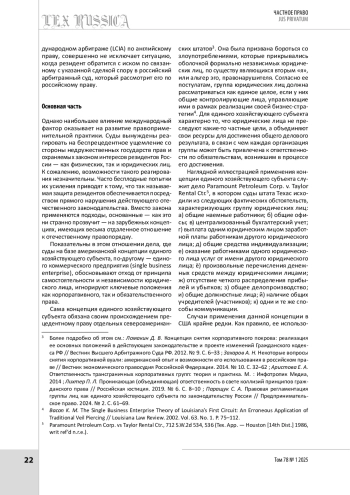 В статье рассматриваются проблемы влияния международного фактора на развитие российского законодательства и правоприменительной практики. Акцент сделан на исследовании неоправданного изменения подхода судов к оценке принципа независимости и самостоятельности юридического лица и применения ими так называемой концепции единого хозяйствующего субъекта (коммерческого предприятия). Использование данной концепции без учета факторов, которым она обязана своим происхождением в Англии и США, приводит к нарушению базовых положений как корпоративного, так и обязательственного права. Например, к ответственности за нарушение обязательства — относительного правоотношения привлекается не только должник, но и третье лицо — интервент, составляющее с ним единый хозяйствующий субъект (коммерческое предприятие). Органы юридического лица — интервента, по сути, понуждаются к совершению действий не в интересах этой организации, что прямо следует из требований закона, а в интересах кредитора в обязательстве. Обозначенный подход кардинально изменяет стандарт поведения субъектов, входящих в состав органов юридического лица. Кроме того, следование концепции единого хозяйствующего субъекта (коммерческого предприятия) не учитывает требования законодательства в публичной сфере, например банковской, где кредитные организации априори не могут ставить интересы кредиторов организаций, образующих с ними пресловутый единый хозяйствующий субъект, выше интересов своих кредиторов (клиентов, вкладчиков).