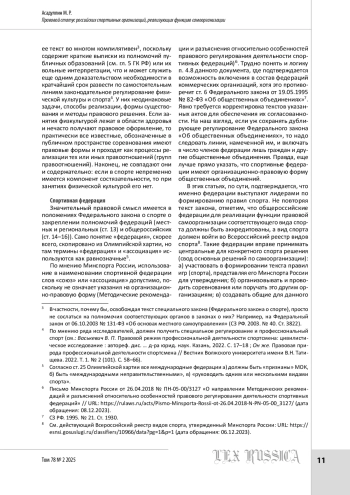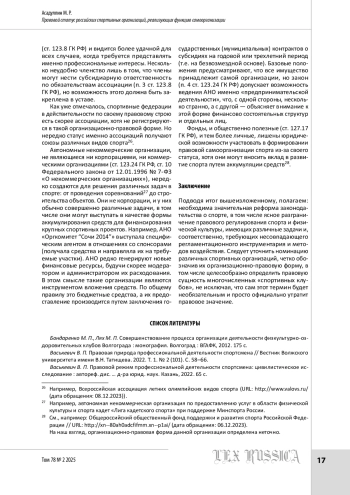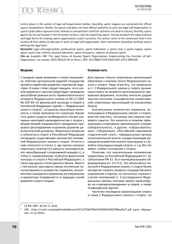 Статья: Правовой статус российских спортивных организаций, реализующих функцию самоорганизации (2025)