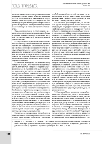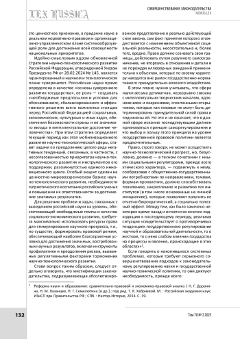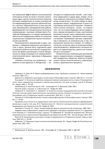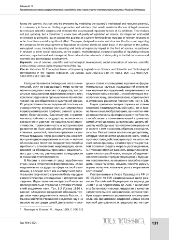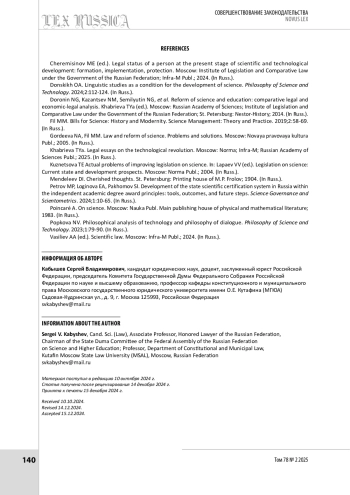 КАБЫШЕВ С. В. КОНЦЕПТУАЛЬНЫЕ ВОПРОСЫ СОВЕРШЕНСТВОВАНИЯ ЗАКОНОДАТЕЛЬСТВА О НАУКЕ И НАУЧНО-ТЕХНОЛОГИЧЕСКОМ РАЗВИТИИ В РОССИЙСКОЙ ФЕДЕРАЦИИ // LEX RUSSICA (РУССКИЙ ЗАКОН). 2025. ТОМ 78, № 2