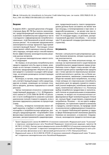 В статье анализируются новеллы Федерального закона от 13.03.2006 № 38-ФЗ «О рекламе», внесенные Федеральным законом от 26.23.2024 № 479-ФЗ, направленные на установление дополнительных требований к рекламе потребительских кредитов (займов). Исследование носит сравнительно-правовой и при этом комплексный характер: автор дает оценку положениям Закона не только на основании юридического (сравнительно-правового) анализа, но и с учетом психологических реалий современной рекламы, характера ее воздействия на потребителя и особенностей восприятия потребителем рекламы финансовых услуг, что позволило вскрыть причины, по которым новеллы Федерального закона «О рекламе» не оптимальны для достижения поставленных целей. Наряду с этим, исследование позволило указать пути повышения эффективности правового регулирования рекламы потребительских кредитов как в части ее содержания, так и в части структуры ее правового регулирования, в которой основная нормотворческая нагрузка ложится не на законодателя, а на регулятора финансового рынка, в компетенцию которого входит не только пруденциальное, но и непруденциальное (поведенческое) регулирование банковской деятельности. Помимо этого, в статье затрагиваются вопросы соотношения традиционного нормативного регулирования и регулирования, основанного на принципах.