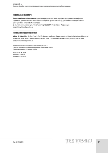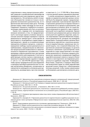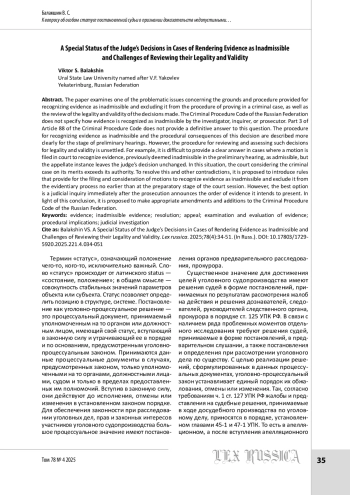 БАЛАКШИН В. С. К ВОПРОСУ ОБ ОСОБОМ СТАТУСЕ ПОСТАНОВЛЕНИЙ СУДЬИ О ПРИЗНАНИИ ДОКАЗАТЕЛЬСТВ НЕДОПУСТИМЫМИ И О ПРОБЛЕМАХ ПРОВЕРКИ ИХ ЗАКОННОСТИ И ОБОСНОВАННОСТИ // LEX RUSSICA (РУССКИЙ ЗАКОН). 2025. ТОМ 78, № 4
