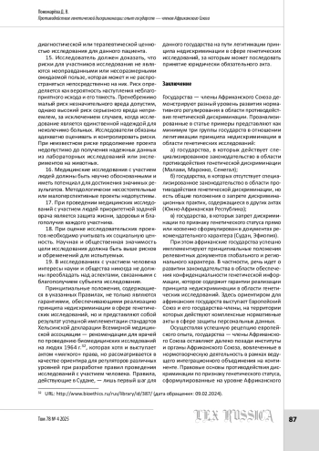 Статья посвящена детальному анализу реализации принципа недискриминации по признаку генетического статуса в рамках Африканского Союза, а также его государств-членов. Автором рассмотрены правовые основы противодействия генетической дискриминации в контексте ведущего регионального интеграционного объединения на Африканском континенте, исследованы ключевые наднациональные механизмы защиты от дискриминации. Особое внимание в исследовании уделено комплексному обзору опыта государств — членов Африканского Союза в части противодействия дискриминационным и стигматизирующим практикам. Опыт Малави, Южно-Африканской Республики, Судана демонстрирует не только приверженность концептуальным подходам в отношении запрета на генетическую дискриминацию, сложившимся на глобальном уровне, но и возможности реализации принципа недискриминации в рассматриваемой сфере в национальном разрезе. Автором сформулированы тенденции развития наднационального и национального регулирования в области противодействия генетической дискриминации на Африканском континенте, предложена рецепция лучших практик для совершенствования релевантной регуляторики в Российской Федерации и интеграционных объединениях с ее участием.