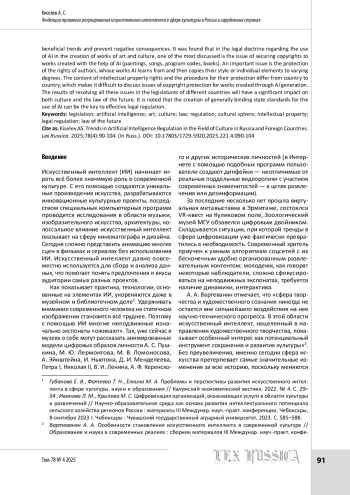 9. Калятин В. О. Определение субъекта прав на результаты интеллектуальной деятельности, созданные с использованием искусственного интеллекта // Право. Журнал Высшей школы экономики. 2022. № 4. С. 24-50.