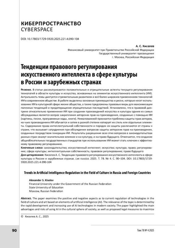 В статье рассматриваются положительные и отрицательные аспекты текущего регулирования технологий в области культуры и искусства, основанных на элементах искусственного интеллекта (ИИ). Актуальность темы диктуется стремительным развитием и всё более широким применением технологий ИИ в современном обществе. В работе выделены основные преимущества и риски, которые несет использование ИИ в культурной сфере жизни общества, а также предложены правовые меры для максимизации полезных тенденций и предотвращения отрицательных последствий. Установлено, что в правовой доктрине относительно применения ИИ при создании произведений искусства и культуры одним из самых обсуждаемых является вопрос закрепления авторских прав на произведения, созданные с помощью ИИ (картины, песни, программные коды, книги). Немаловажной признается проблема защиты прав авторов, на чьих произведениях ИИ обучается и затем в разной степени копирует их стиль или отдельные элементы. Содержание права интеллектуальной собственности и порядок их защиты различаются от страны к стране, что вызывает затруднения при обсуждении вопросов защиты авторских прав на произведения, созданные посредством генерации ИИ. Результаты разрешения всех этих вопросов в законодательствах разных стран окажут значительное влияние и на культуру, и на право будущего. Отмечается, что создание общеобязательных государственных стандартов при использовании ИИ может стать ключом к эффективному правовому регулированию.