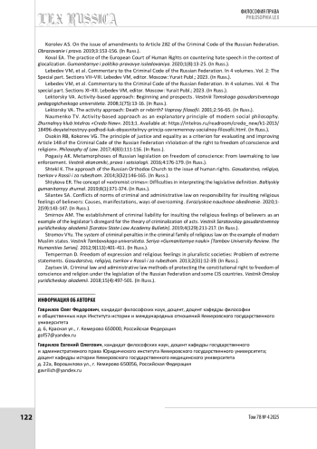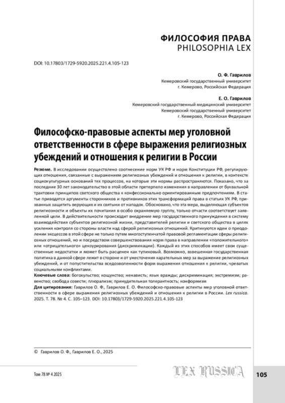 ГАВРИЛОВ О. Ф., ГАВРИЛОВ Е. О. ФИЛОСОФСКО-ПРАВОВЫЕ АСПЕКТЫ МЕР УГОЛОВНОЙ ОТВЕТСТВЕННОСТИ В СФЕРЕ ВЫРАЖЕНИЯ РЕЛИГИОЗНЫХ УБЕЖДЕНИЙ И ОТНОШЕНИЯ К РЕЛИГИИ В РОССИИ // LEX RUSSICA (РУССКИЙ ЗАКОН). 2025. ТОМ 78, № 4