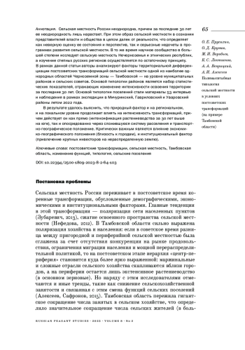 Сельская местность России переживает в постсоветское время коренные трансформации, обусловленные демографическими, экономическими и институциональными факторами. Главные тенденции в этой трансформации — поляризация сети населенных пунктов (Зубаревич, 2013), сжатие освоенного пространства сельской местности (Нефедова, 2012). В Тамбовской области сильно выражена поляризация хозяйства и населения: если в советское время разница между пригородной и периферийной сельской местностью была сглажена за счет отсутствия конкуренции на рынке продовольствия, ограничения миграции населения и мощной перераспределительной политикой, то на постсоветском этапе иерархия «центр-периферия» становится куда более ярко выраженной: маржинальные и сложные отрасли сельского хозяйства скапливаются вблизи городов, а на периферии остается лишь экстенсивное растениеводство (в основном зерновые).
