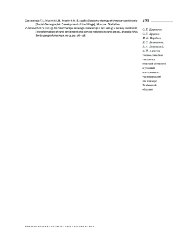 1. Аверкиева К. B. (2022). Внутрисельская миграция населения и локальные процессы трансформации сельской местности в лесной зоне староосвоенного Нечерноземья // Известия Российской академии наук. Серия географическая. № 6. С. 828-841.