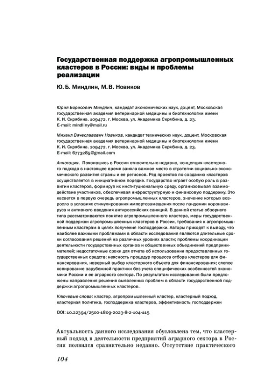 Появившись в России относительно недавно, концепция кластерного подхода в настоящее время заняла важное место в стратегии социально-экономического развития страны и ее регионов. Ряд проектов по созданию кластеров осуществляется в инициативном порядке. Государство играет особую роль в развитии кластеров, формируя их институциональную среду, организовывая взаимодействие участников, обеспечивая инфраструктурную и финансовую поддержку. Это касается в первую очередь агропромышленных кластеров, значение которых возросло в условиях стимулирования импортозамещения после пандемии коронавируса и активного введения антироссийских санкций. В данной статье обзорного типа рассматриваются понятие агропромышленного кластера, меры государственной поддержки агропромышленных кластеров в России, требования к агропромышленным кластерам в целях получения господдержки. Авторы приходят к выводу, что наиболее важными проблемами в области исследования являются длительные сроки согласования решений на различных уровнях власти; проблемы координации деятельности государственных органов и общественных объединений предпринимателей; недостаточные сроки для отчета об использовании предоставленных государственных средств; неясность процедур процесса отбора кластеров для финансирования, неверный выбор кластерного объекта для финансирования; слепое копирование зарубежной практики без учета специфических особенностей экономики России и ее аграрного сектора. По результатам исследования были предложены направления решения выявленных проблем в области государственной поддержки агропромышленных кластеров.