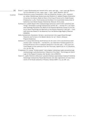 26. Сухова О. А. (2008). Десять мифов крестьянского сознания: очерки истории социальной психологии и менталитета русского крестьянства (конец XIX - начало XX в.) по материалам Среднего Поволжья. М.: РОССПЭН. EDN: QPJZTF