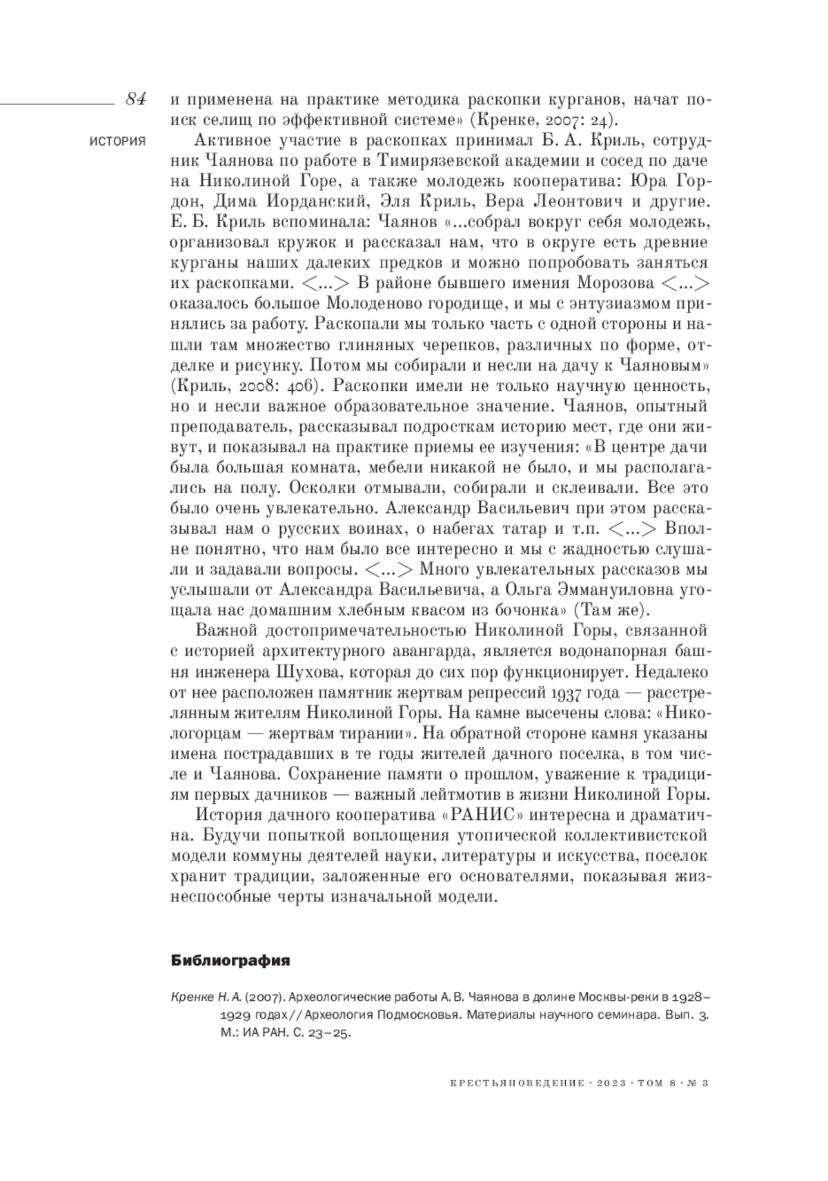 1. Кренке Н. А. (2007). Археологические работы А. В. Чаянова в долине Москвы-реки в 1928-1929 годах // Археология Подмосковья. Материалы научного семинара. Вып. 3. М.: ИА РАН. С. 23-25. EDN: GQJZJK