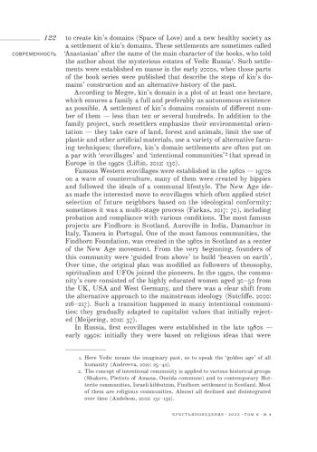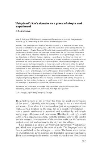 The article focuses on kin’s domains - plots of at least one hectare, which became so called since the early 2000s, after the publication of the series of books by Vladimir Megre - Ringing Cedars of Russia. Megre described his meeting with the Siberian hermit Anastasia and her nostalgic stories about the kin’s domain settlements of the Vedic Russia. Readers, inspired by this narrative of the ‘golden age’, tried to create this utopia in different Russian regions - according to the followers, there are more than 500 such settlements. Kin’s domain is usually organized on agricultural land and needs the entire infrastructure, so practical skills, technical knowledge and creativity are valued by the participants. In many ways, such settlements follow the global trend of ecovillages as laboratories of sustainable development, autonomy, harmonious coexistence of man and nature, spiritual development and healing. The author shows how the economic and ideological crisis of the 1990s determined the rise of alternative teachings and the enthusiasm of builders of a bright future. At the same time, many active participants of first ecovillages and kin’s domains followed the Soviet discourse, emphasizing the significance of Soviet morality and creative self-activity. The article is based on the field studies conducted in 2008-2021 in kin’s domain settlements and at the meetings of Anastasians, and on the Internet sources.