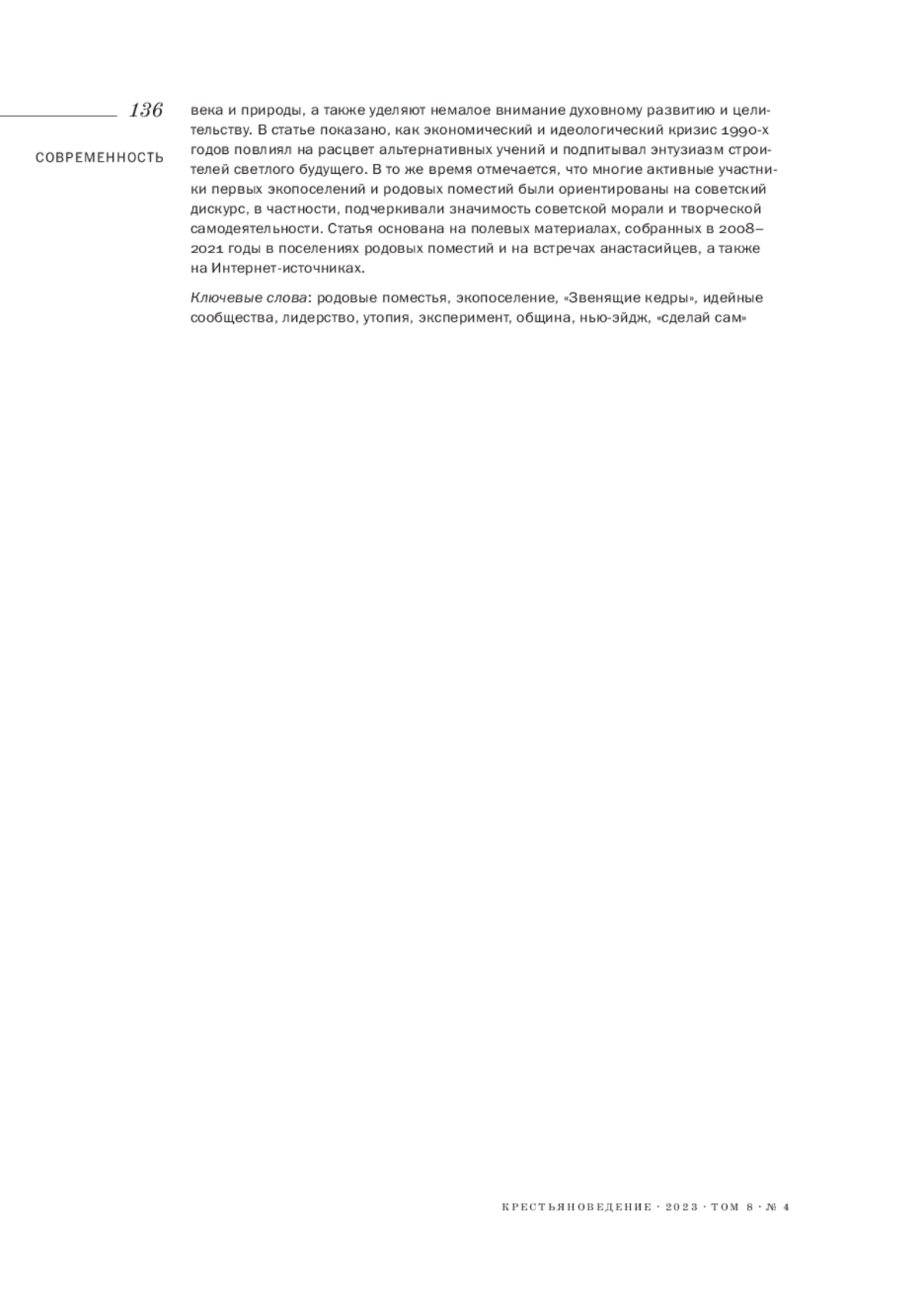 В центре внимания статьи находятся родовые поместья - участки земли не менее одного гектара, которые стали так называться с начала 2000-х годов, после выхода в свет серии книг Владимира Мегре «Звенящие кедры России». Мегре описал историю своего знакомства с сибирской отшельницей Анастасией и ее ностальгические рассказы о родовых поселениях Ведической Руси. Читатели, вдохновленные повествованием о «золотом веке», принялись воссоздавать эту утопию в разных регионах России - сегодня существует более 500 таких поселений. Родовое поместье чаще всего обустраивается на земле сельскохозяйственного назначения и требует создания всей инфраструктуры, поэтому среди участников ценятся практические навыки, технические знания и креативность. Во многом такие поселения следуют мировой тенденции экопоселений, которые считаются лабораторией устойчивого развития, автономности, гармоничного сосуществования человека и природы, а также уделяют немалое внимание духовному развитию и целительству. В статье показано, как экономический и идеологический кризис 1990-х годов повлиял на расцвет альтернативных учений и подпитывал энтузиазм строителей светлого будущего. В то же время отмечается, что многие активные участники первых экопоселений и родовых поместий были ориентированы на советский дискурс, в частности, подчеркивали значимость советской морали и творческой самодеятельности. Статья основана на полевых материалах, собранных в 2008-2021 годы в поселениях родовых поместий и на встречах анастасийцев, а также на Интернет-источниках.