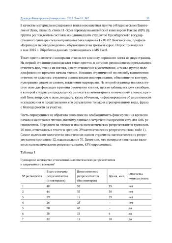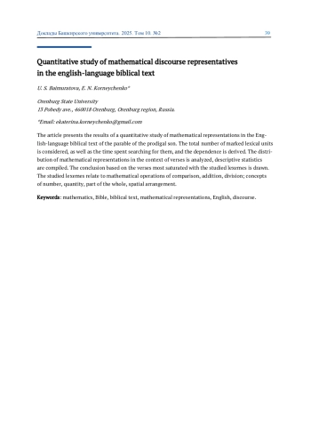 В статье приводятся результаты количественного исследования математических репрезентантов в англоязычном библейском тексте притчи о блудном сыне. Рассматривается суммарное количество отмеченных лексических единиц, а также времени, затраченного на их поиски, выводится зависимость. Анализируется распределение математических репрезентантов в разрезе стихов, составляется описательная статистика, делается вывод по наиболее насыщенным исследуемыми лексемами стихам. Исследованные лексемы относятся к математическим операциям сравнения, сложения, деления; понятиям числа, количества, части от целого, пространственного расположения.