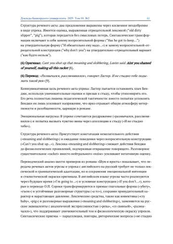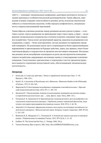 Статья исследует особенности передачи речевых актов неодобрения, в частности речевых актов «угроза» и «упрек», в романе У. Фолкнера «Шум и ярость» и его переводе на русский язык. Работа расширяет понимание речевых актов как средств социального регулирования и межличностного конфликта. Авторы приходят к выводу, что переводчику удается адекватно передать структуру, эмоциональную нагрузку и коммуникативную цель рассматриваемых речевых актов. В целом анализ свидетельствует об успешной адаптации специфических способов выражения речевых актов угрозы и упрека с сохранением их воздействия на читателя.