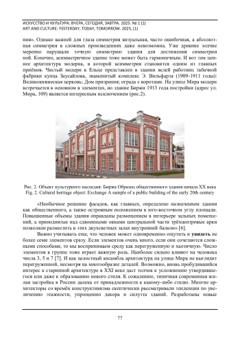 Работа посвящена выявлению закономерностей, лежащих в основе стилистического облика городской купеческой архитектуры Ельца рубежа XIX-XX веков. Определены три основных фактора, напрямую оказавших воздействие на купеческую архитектуру: технический прогресс, влиятельное положение купеческого сословия и несформированность еще самостоятельного стиля, побуждающие архитекторов черпать вдохновение в объектах более ранних эпох. Однако пристальное внимание современной публики к сохранившимся историческим памятникам в древних городах, также государственная поддержка, растущий туристический поток в Ельце сегодня, явно присутствующий «фирменный стиль» (образ) города - все это говорит не только об исторической ценности сохранившегося памятника архитектуры и градостроительства, но и о самостоятельности, самоценности планировки и стиля, в котором он выполнен. Проведенный в социальных сетях опрос жителей и гостей города показал высокую оценку не только исторической, но и эстетической ценности елецкой архитектуры. Однако резкой критике подверглось состояние фасадов зданий, обветшалость и заброшенность экстерьеров и интерьеров. Так большое количество заброшенных зданий в исторической части города не позволяет воссоздать полноту мысли градоустроителей XIX-XX веков. Разнообразие стилистических решений, вплоть по настоящее время, не способствовало сохранению стилевой гармонии, но вместе с тем не привело к размыванию образа исторического купеческого города центральной России.