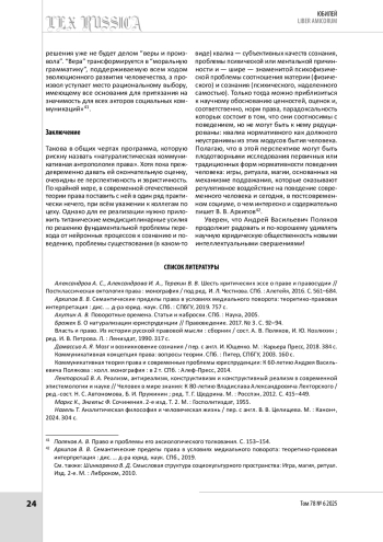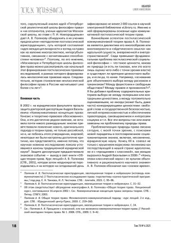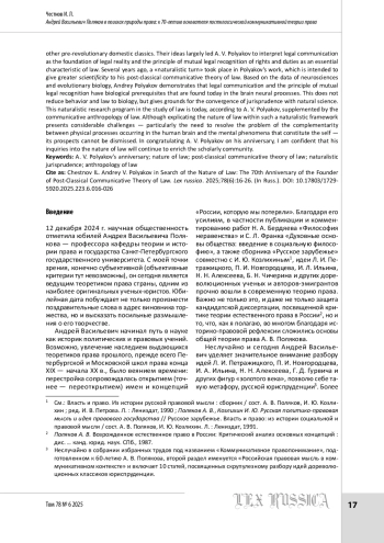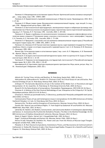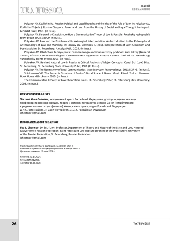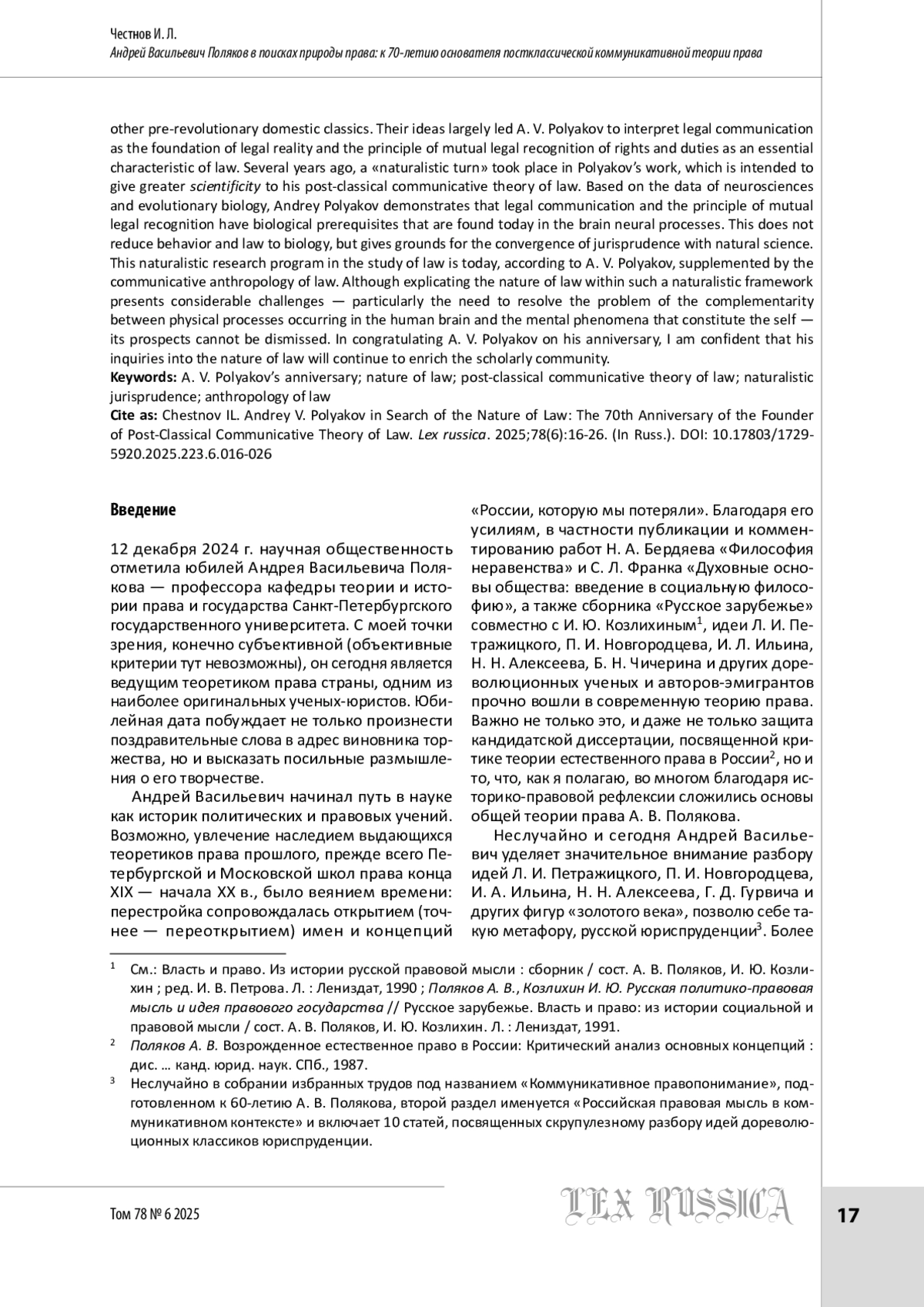 ЧЕСТНОВ И. Л. АНДРЕЙ ВАСИЛЬЕВИЧ ПОЛЯКОВ В ПОИСКАХ ПРИРОДЫ ПРАВА: К 70-ЛЕТИЮ ОСНОВАТЕЛЯ ПОСТКЛАССИЧЕСКОЙ КОММУНИКАТИВНОЙ ТЕОРИИ ПРАВА // LEX RUSSICA (РУССКИЙ ЗАКОН). 2025. ТОМ 78, № 6