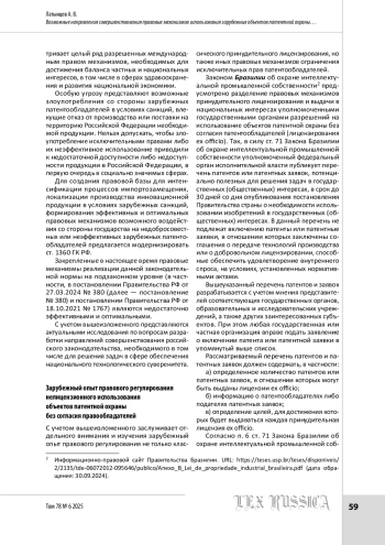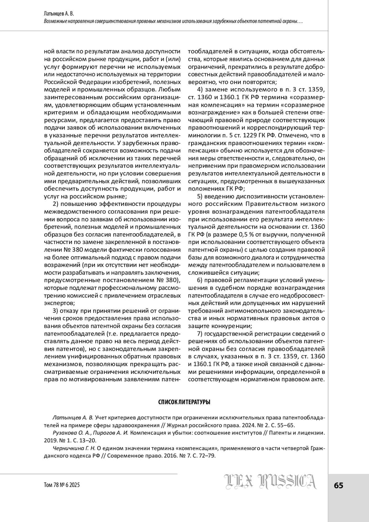 1. Латынцев А. В. Учет критериев доступности при ограничении исключительных права патентообладателей на примере сферы здравоохранения // Журнал российского права. 2024. № 2. С. 55-65.