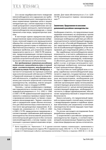 В условиях необходимости интенсификации импортозамещения инновационной продукции, в первую очередь в социально значимых сферах, особую роль приобретает возможность правомерного применения российскими организациями не используемых или недостаточно используемых в Российской Федерации зарубежных изобретений, полезных моделей и промышленных образцов без согласия патентообладателей с извещением их и выплатой вознаграждения в установленном законодательством порядке. Однако в российских нормативных актах недостаточно конкретизированы необходимые для этого правовые механизмы. Особого внимания заслуживает необходимость существенной модернизации правового инструментария использования по решению российского Правительства объектов патентной охраны без согласия патентообладателей в интересах национальной безопасности (ст. 1360 ГК РФ). По результатам комплексного анализа отечественного и зарубежного опыта правового регулирования патентных правоотношений, а также с учетом международных обязательств Российской Федерации были разработаны предложения по модернизации данной правовой нормы с целью интенсификации процессов импортозамещения. Так, предложено ввести модель, при которой формируются перечни не используемых или недостаточно используемых на территории Российской Федерации изобретений, полезных моделей и промышленных образцов, после публикации которых любые заинтересованные российские организации, соответствующие общим установленным критериям, смогут подать заявки об использовании включенных в них результатов интеллектуальной деятельности. Данная модель представляется более эффективной и оптимальной для решения стоящих перед Россией задач по комплексному и широкомасштабному импортозамещению с целью решения задач по обеспечению национального технологического суверенитета.