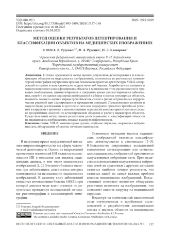 В статье предлагается метод оценки результатов детектирования и классификации объектов на медицинских изображениях, полученных по результатам компьютерной томографии внутренних органов человека нейросетью архитектуры YOLO, содержащий алгоритм и математические модели нечеткой оценки. Разработанные алгоритм и модели позволяют классифицировать объекты в зависимости от их расположения и проекции изображения, автоматизировать и сократить время диагностирования заболевания, перейти от оценки двумерных изображений к сборке и оценке трехмерных объектов, повысить точность оценки параметров объектов, снизить риски неправильных хирургических решений при планировании и проведении операций. Предложенные алгоритм и модели были реализованы в прототипе системы поддержки принятия врачебных решений в хирургии и урологии с использованием технологий компьютерного зрения в составе программных модулей по детектированию объектов и расчету параметров объектов. Представленный метод оценки результатов детектирования и классификации объектов на медицинских изображениях показал высокую эффективность.