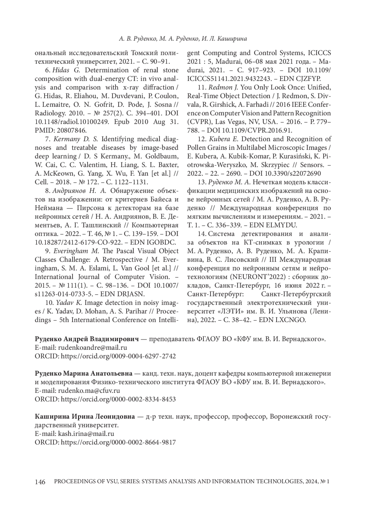 14. Система детектирования и анализа объектов на КТ-снимках в урологии / М. А. Руденко, А. В. Руденко, М. А. Крапивина, В. С. Лисовский // III Международная конференция по нейронным сетям и нейротехнологиям (NEURONT’2022): сборник докладов, Санкт-Петербург, 16 июня 2022 г. -Санкт-Петербург: Санкт-Петербургский государственный электротехнический университет “ЛЭТИ” им. В. И. Ульянова (Ленина), 2022. - С. 38-42. EDN: LXCNGO
