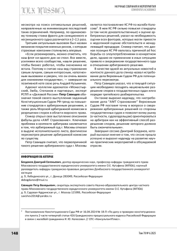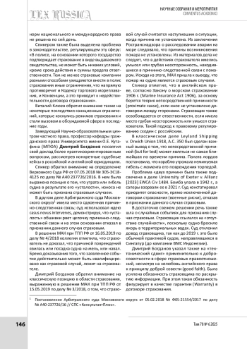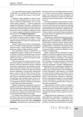 В статье дан обзор панельной дискуссии «Морское страхование: как не разбиться о скалы?», прошедшей 26 марта 2025 г. Модератором дискуссии выступил заведующий кафедрой морского права Университета имени О. Е. Кутафина (МГЮА) Михаил Кротов. В рамках панельной дискуссии обсуждались важные и острые вопросы в области морского страхования и морского права в целом. В дискуссии приняли участие представители профессионального юридического сообщества, заинтересованные в развитии отношений в области морского права. Спикеры анализировали особенности национального регулирования, международные акты, обсуждали способы и средства преодоления выявленных несовершенств и оптимальные модели правового регулирования. Была создана необходимая площадка для конструктивного и продуктивного диалога, результаты которого могут быть положены в основу дорожной карты по реформированию специального регулирования.