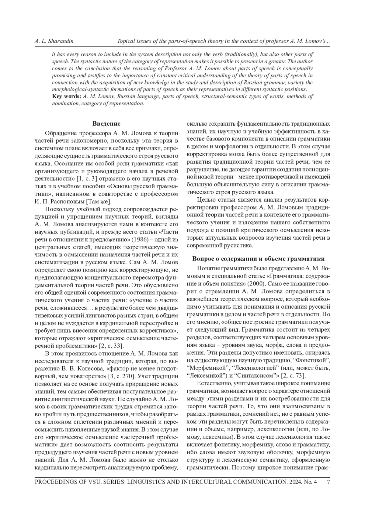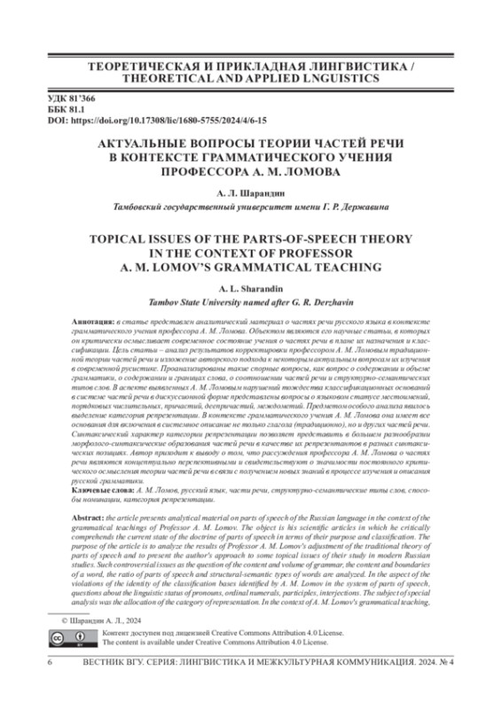 В статье представлен аналитический материал о частях речи русского языка в контексте грамматического учения профессора А. М. Ломова. Объектом являются его научные статьи, в которых он критически осмысливает современное состояние учения о частях речи в плане их назначения и классификации. Цель статьи - анализ результатов корректировки профессором А. М. Ломовым традиционной теории частей речи и изложение авторского подхода к некоторым актуальным вопросам их изучения в современной русистике. Проанализированы такие спорные вопросы, как вопрос о содержании и объеме грамматики, о содержании и границах слова, о соотношении частей речи и структурно-семантических типов слов. В аспекте выявленных А. М. Ломовым нарушений тождества классификационных оснований в системе частей речи в дискуссионной форме представлены вопросы о языковом статусе местоимений, порядковых числительных, причастий, деепричастий, междометий. Предметом особого анализа явилось выделение категория репрезентации. В контексте грамматического учения А. М. Ломова она имеет все основания для включения в системное описание не только глагола (традиционно), но и других частей речи. Синтаксический характер категории репрезентации позволяет представить в большем разнообразии морфолого-синтаксические образования частей речи в качестве их репрезентантов в разных синтаксических позициях. Автор приходит к выводу о том, что рассуждения профессора А. М. Ломова о частях речи являются концептуально перспективными и свидетельствуют о значимости постоянного критического осмысления теории частей речи в связи с получением новых знаний в процессе изучения и описания русской грамматики.