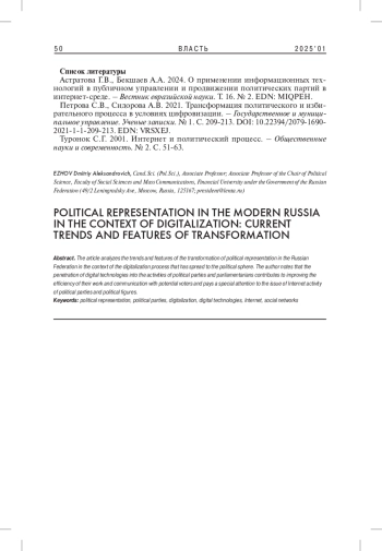 1. Астратова Г.В., Бекшаев А.А. 2024. О применении информационных технологий в публичном управлении и продвижении политических партий в интернет-среде. - Вестник евразийской науки. Т. 16. № 2. EDN: MIQPEH