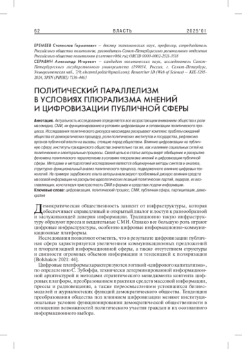 ЕРЕМЕЕВ С. Г., СЕРАВИН А. И. ПОЛИТИЧЕСКИЙ ПАРАЛЛЕЛИЗМ В УСЛОВИЯХ ПЛЮРАЛИЗМА МНЕНИЙ И ЦИФРОВИЗАЦИИ ПУБЛИЧНОЙ СФЕРЫ // ВЛАСТЬ. 2025. ТОМ 33 № 1