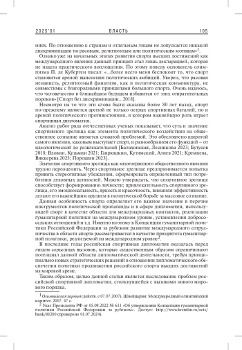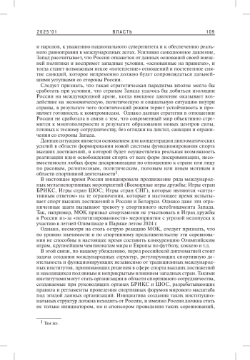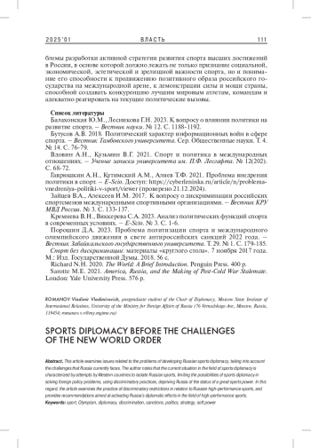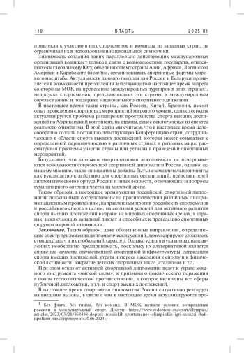 РОМАНОВ В. В. СПОРТИВНАЯ ДИПЛОМАТИЯ ПЕРЕД ВЫЗОВАМИ НОВОГО МИРОВОГО ПОРЯДКА // ВЛАСТЬ. 2025. ТОМ 33 № 1