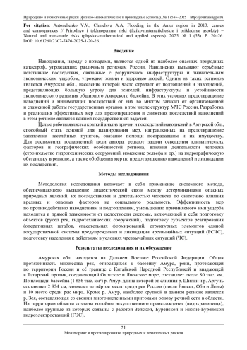Рассмотрены причины наводнения в Амурской обл. в 2013 г. и действия органов власти, направленные на оказание помощи пострадавшему населению и организацию мер, способных ослабить негативные последствия от чрезвычайной ситуации. Рассматриваются климатические и географические факторы, способствующие возникновению паводков, включая влияние муссонных дождей и деятельность человека. Особое внимание уделено работе государственных служб, в частности МЧС России, в области ликвидации последствий наводнения, эвакуации населения и восстановления инфраструктуры. Рассматриваются меры по предотвращению подобных катастроф в будущем, включая инженерные решения, регулирование работы гидротехнических сооружений и улучшение системы информирования населения. Опыт борьбы с наводнением 2013 г. позволяет выработать эффективные стратегии для минимизации ущерба от подобных чрезвычайных ситуаций.