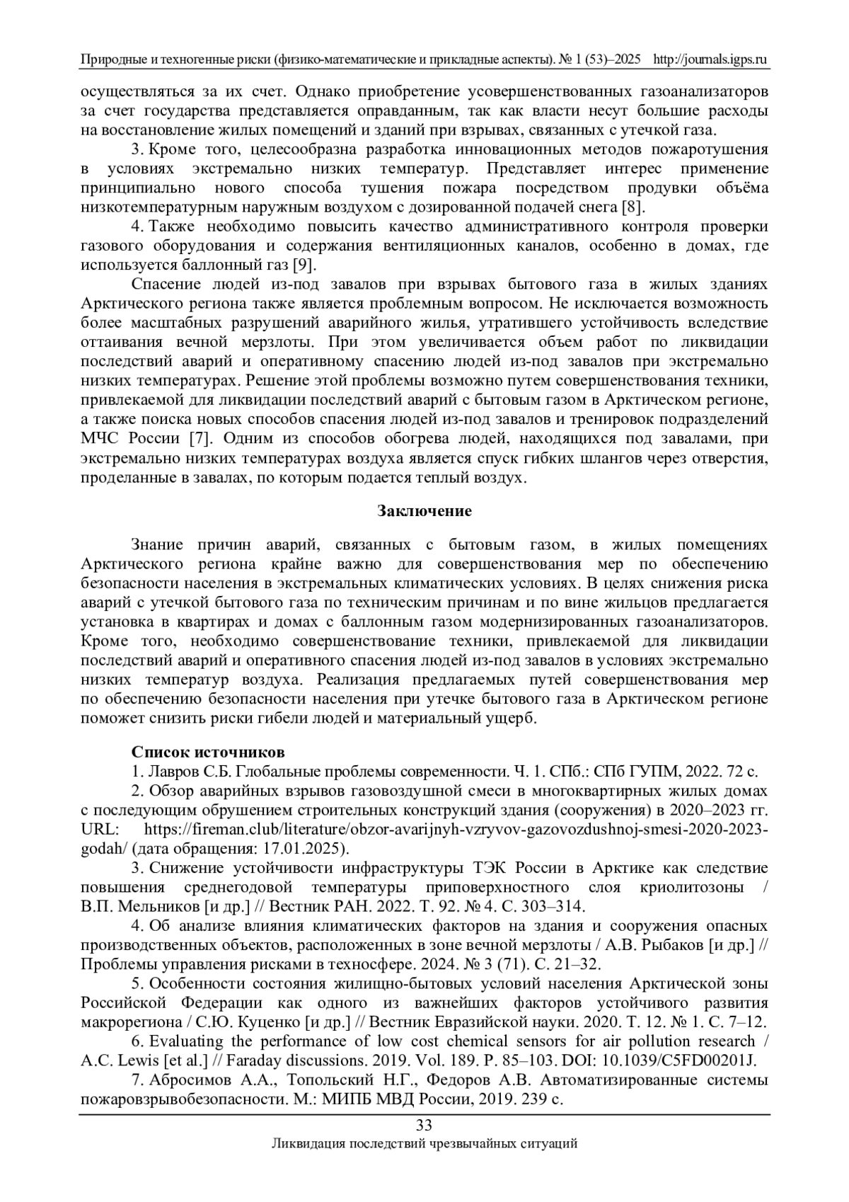 Рассматриваются проблемы, связанные с обеспечением безопасности населения при авариях с утечкой бытового газа, характерных для жилых домов Арктической зоны вследствие географических и климатических условий. Проведен анализ основных причин аварий с бытовым газом на территории России и сформулированы их особенности. Предлагаются пути усовершенствования мер безопасности посредством установки улучшенных газоанализаторов в квартирах с возможностью оповещения газовых охранных служб и жильцов, применения более совершенных технических средств тушения пожаров, способов ликвидации последствий разрушений и средств по экстренному спасению пострадавших из-под завалов при экстремально низких температурах воздуха.