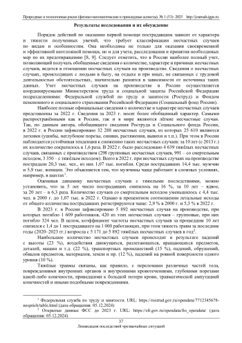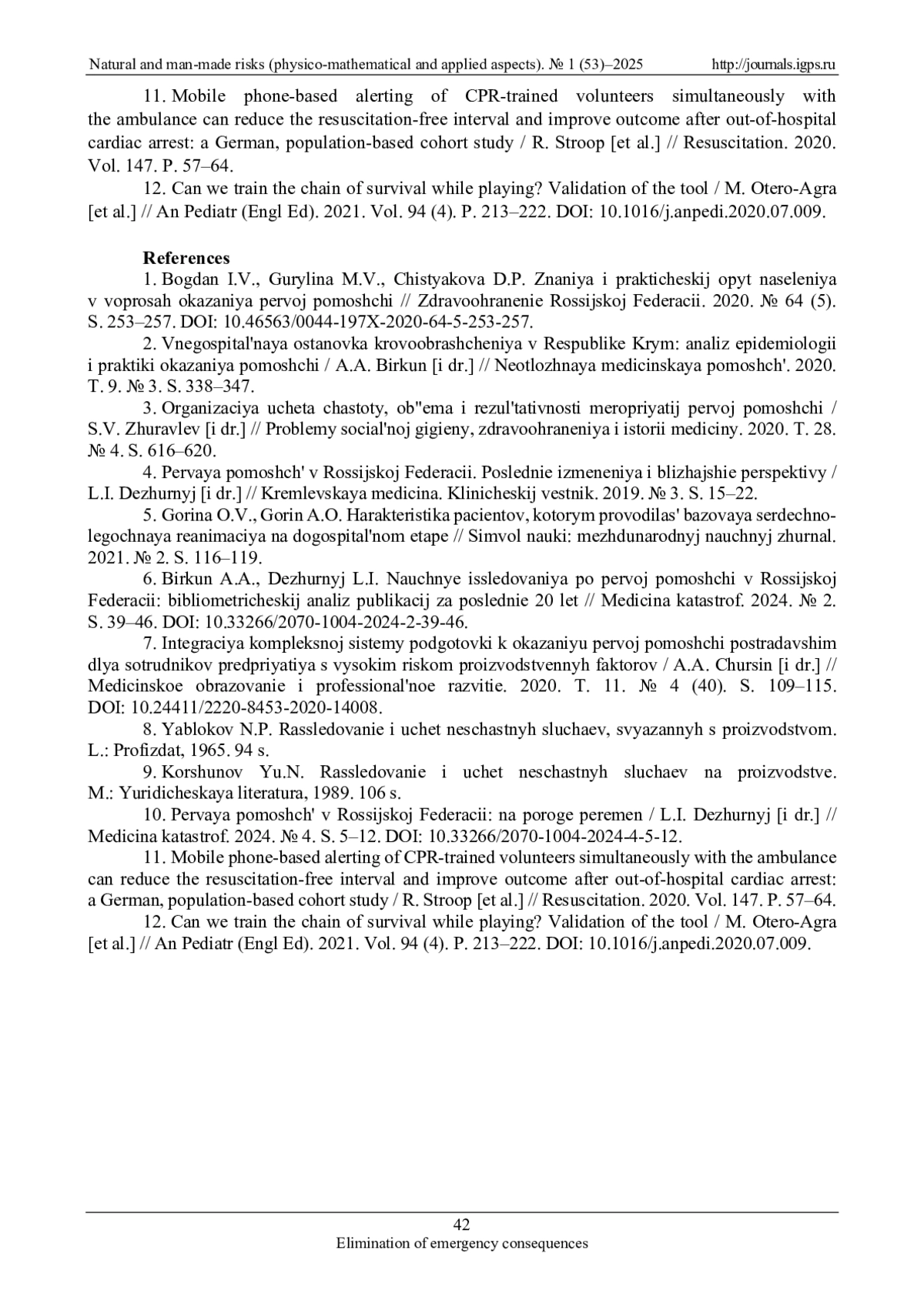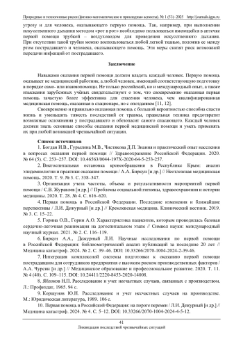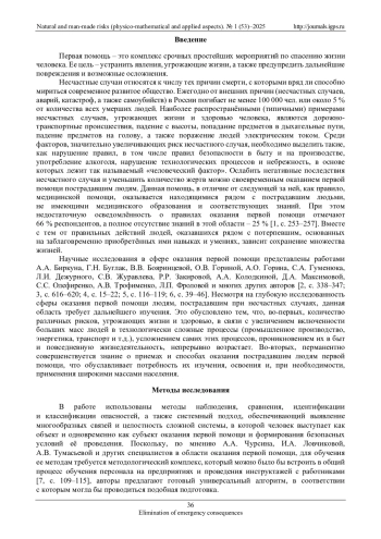 АНТОНЧЕНКО В. В., САЛЬНИКОВ В. А. ОКАЗАНИЕ ПЕРВОЙ ПОМОЩИ ПОСТРАДАВШИМ ОТ НЕСЧАСТНЫХ СЛУЧАЕВ // ПРИРОДНЫЕ И ТЕХНОГЕННЫЕ РИСКИ (ФИЗИКО-МАТЕМАТИЧЕСКИЕ И ПРИКЛАДНЫЕ АСПЕКТЫ). 2025. № 1 (53)