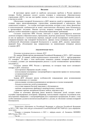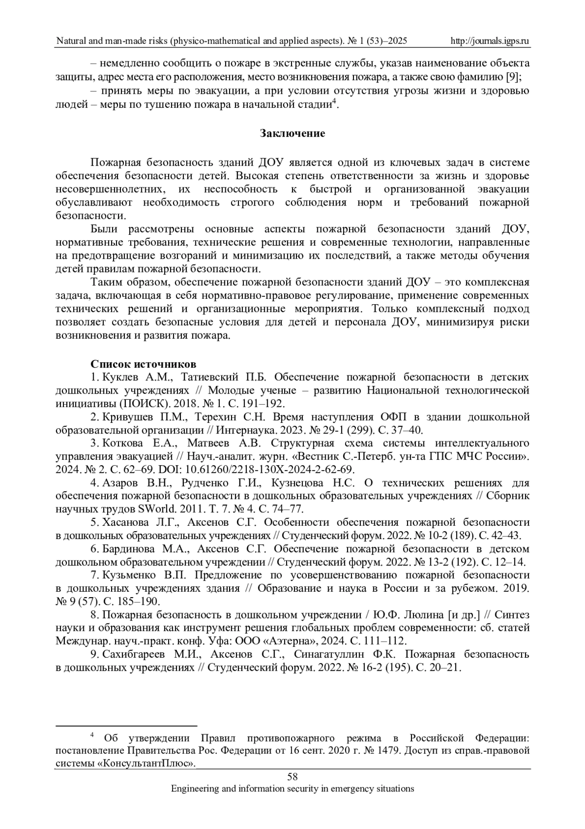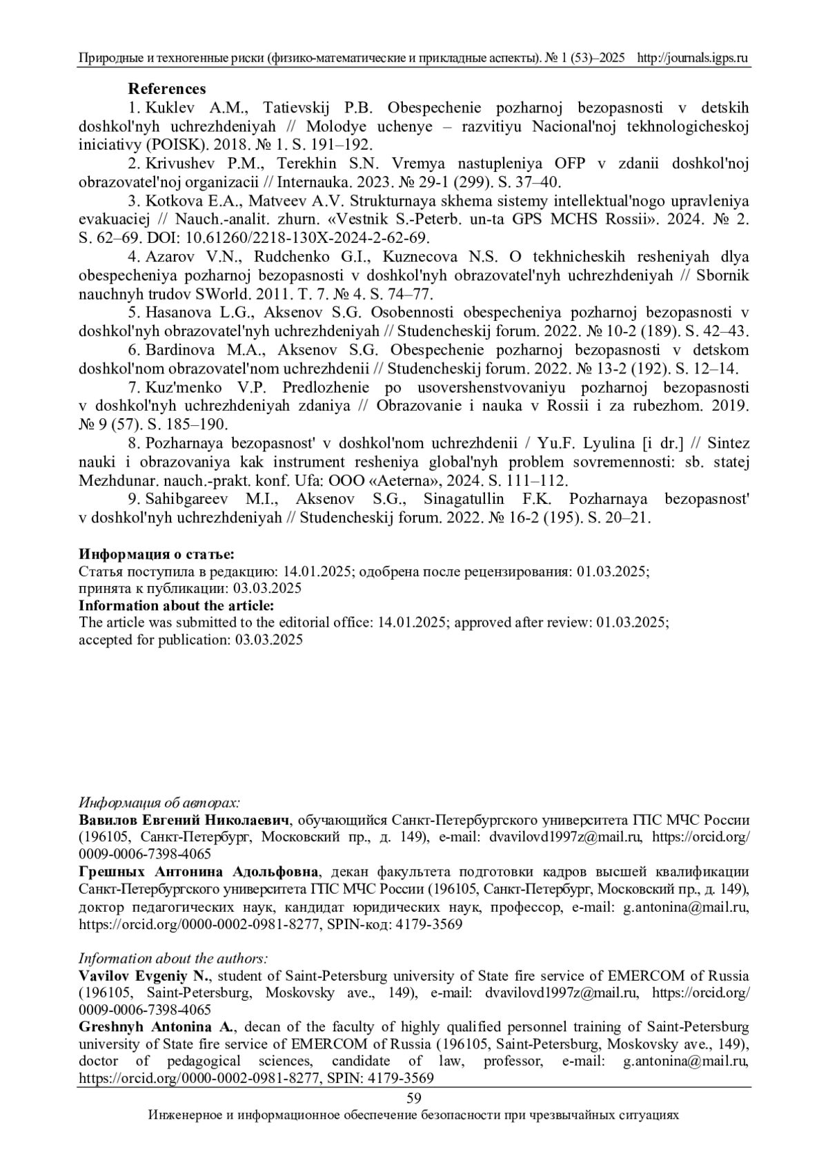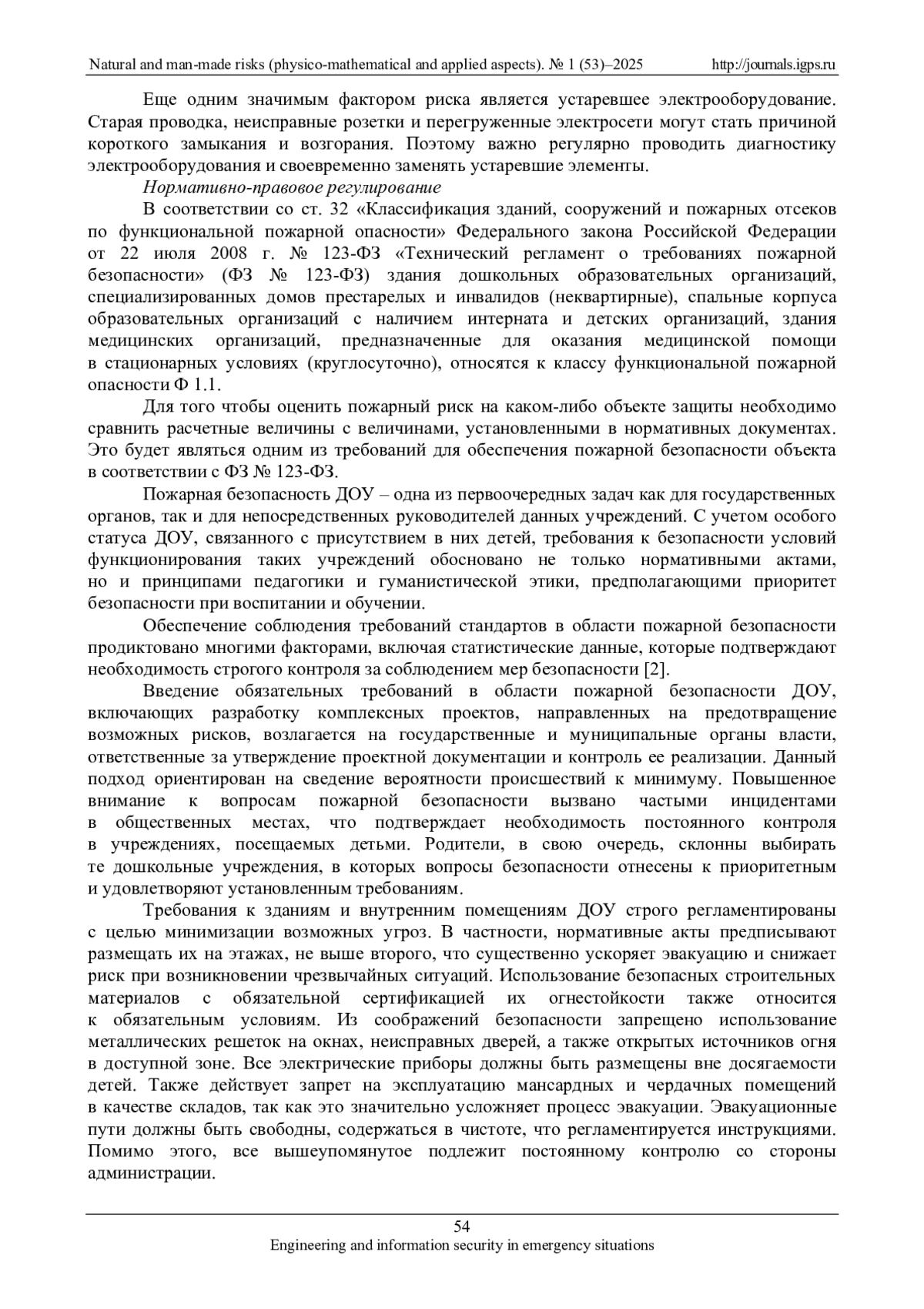 ВАВИЛОВ Е. Н., ГРЕШНЫХ А. А. ОСОБЕННОСТИ ОБЕСПЕЧЕНИЯ ПОЖАРНОЙ БЕЗОПАСНОСТИ ЗДАНИЙ ДОШКОЛЬНЫХ ОБРАЗОВАТЕЛЬНЫХ УЧРЕЖДЕНИЙ // ПРИРОДНЫЕ И ТЕХНОГЕННЫЕ РИСКИ (ФИЗИКО-МАТЕМАТИЧЕСКИЕ И ПРИКЛАДНЫЕ АСПЕКТЫ). 2025. № 1 (53)