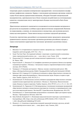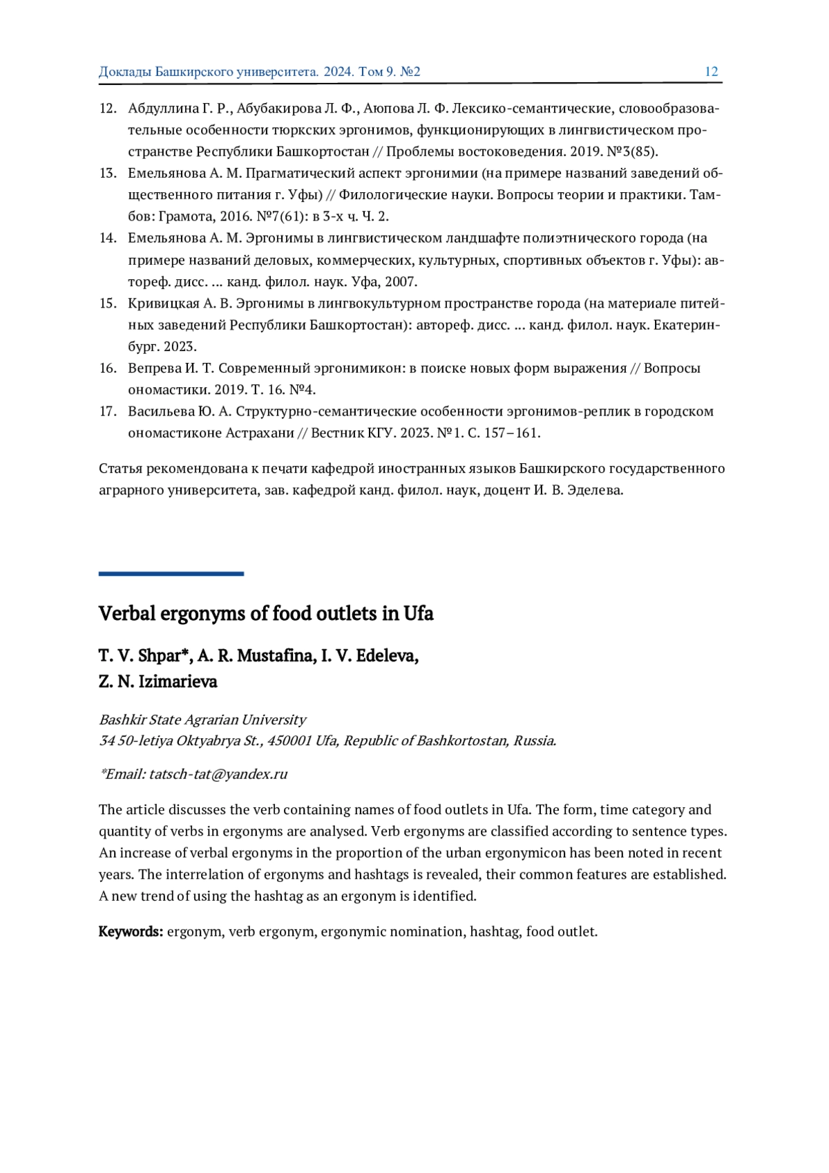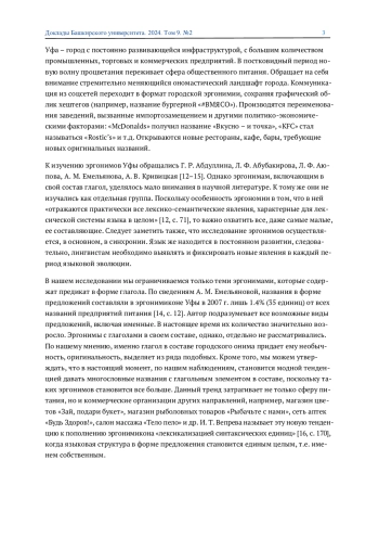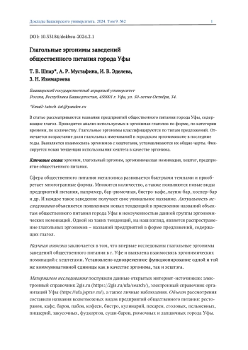 Статья: ГЛАГОЛЬНЫЕ ЭРГОНИМЫ ЗАВЕДЕНИЙ ОБЩЕСТВЕННОГО ПИТАНИЯ ГОРОДА УФЫ (2024)