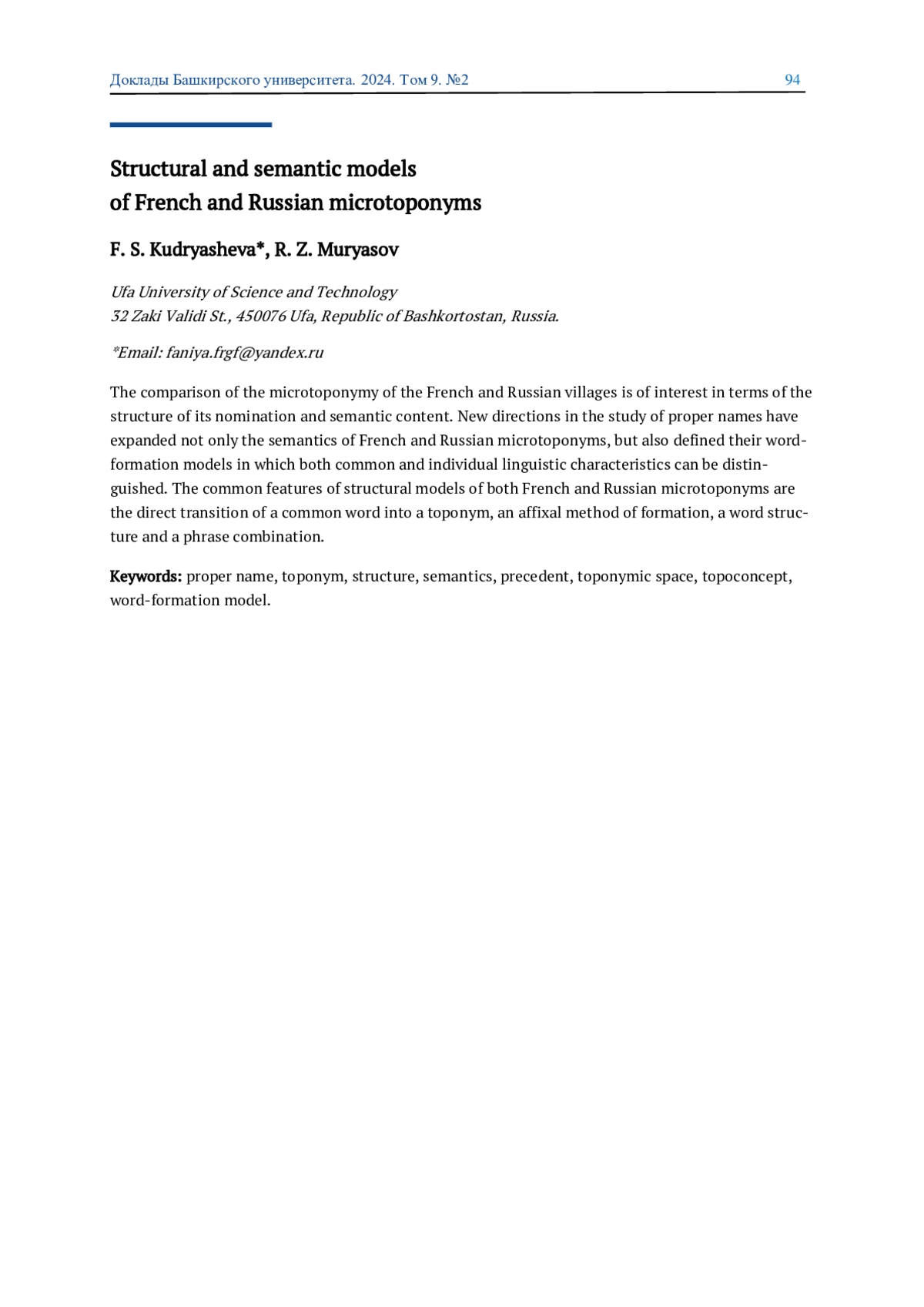 Сравнение микротопонимики французской и русской деревни представляет интерес для исследования структуры топонимической номинации и ее смыслового наполнения. Новые направления в исследовании имен собственных расширили не только семантику французских и русских микротопонимов, но и определили их словообразовательные модели, в которых можно выделить как общие, так и индивидуальные языковые характеристики. Общими чертами для структурных моделей французских и русских микротопонимов являются: прямой переход нарицательного слова в топоним, аффиксальный способ образования, словосложение и словосочетание.