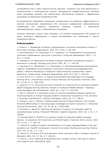 1. Есина Л. С. Внедрение чат-ботов в преподавание и изучение иностранных языков // Мир науки, культуры, образования. 2024. № 2 (105). С. 201-204.