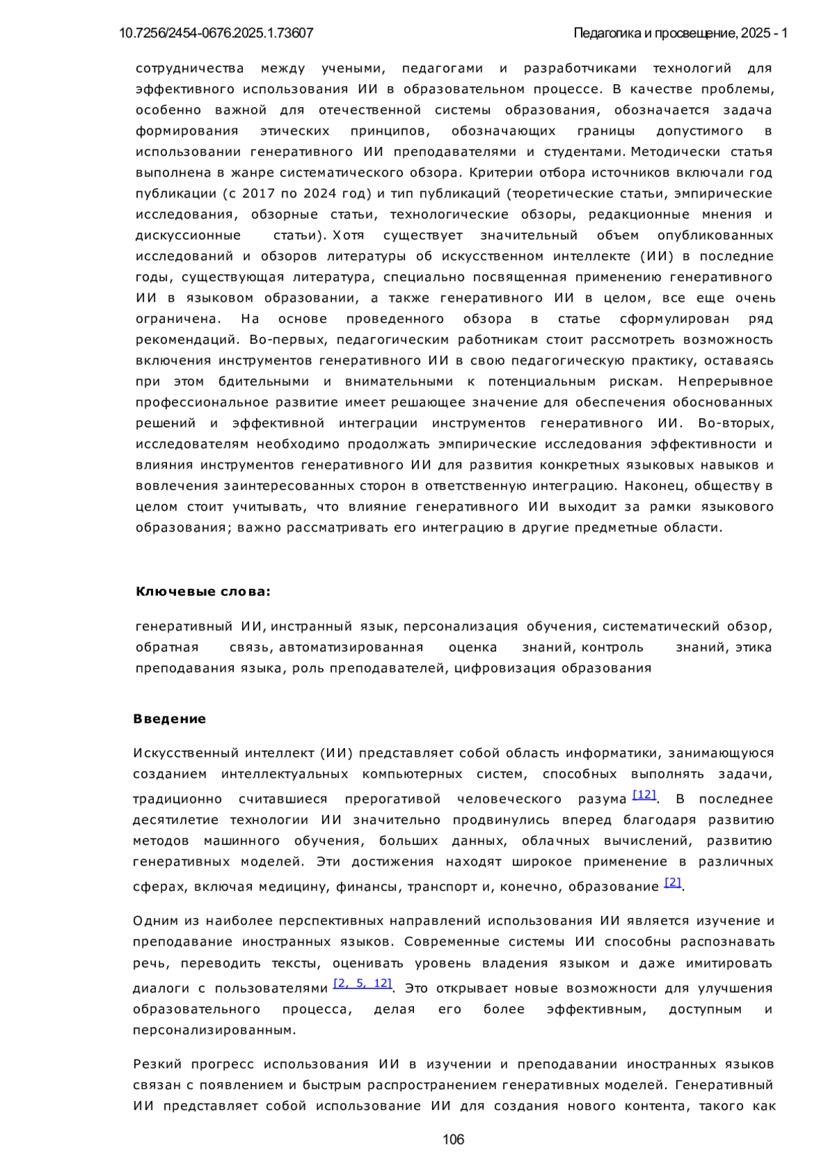Статья посвящена применению генеративного искусственного интеллекта (ИИ) в изучении и преподавании иностранных языков. В последние годы ИИ активно внедряется в образовательный процесс, предлагая персонализированные подходы, автоматизированную оценку знаний и интерактивные методы обучения. Авторы анализируют существующие исследования и выделяют основные направления использования генеративного ИИ: чат-боты, диалоговые системы, платформы для обучения письму и адаптивные образовательные технологии. В заключение формулируются практические рекомендации для преподавателей, исследователей и образовательных организаций по интеграции генеративного ИИ в языковое образование. Работа подчеркивает важность дальнейших исследований и сотрудничества между учеными, педагогами и разработчиками технологий для эффективного использования ИИ в образовательном процессе. В качестве проблемы, особенно важной для отечественной системы образования, обозначается задача формирования этических принципов, обозначающих границы допустимого в использовании генеративного ИИ преподавателями и студентами. Методически статья выполнена в жанре систематического обзора. Критерии отбора источников включали год публикации (с 2017 по 2024 год) и тип публикаций (теоретические статьи, эмпирические исследования, обзорные статьи, технологические обзоры, редакционные мнения и дискуссионные статьи). Хотя существует значительный объем опубликованных исследований и обзоров литературы об искусственном интеллекте (ИИ) в последние годы, существующая литература, специально посвященная применению генеративного ИИ в языковом образовании, а также генеративного ИИ в целом, все еще очень ограничена. На основе проведенного обзора в статье сформулирован ряд рекомендаций. Во-первых, педагогическим работникам стоит рассмотреть возможность включения инструментов генеративного ИИ в свою педагогическую практику, оставаясь при этом бдительными и внимательными к потенциальным рискам. Непрерывное профессиональное развитие имеет решающее значение для обеспечения обоснованных решений и эффективной интеграции инструментов генеративного ИИ. Во-вторых, исследователям необходимо продолжать эмпирические исследования эффективности и влияния инструментов генеративного ИИ для развития конкретных языковых навыков и вовлечения заинтересованных сторон в ответственную интеграцию. Наконец, обществу в целом стоит учитывать, что влияние генеративного ИИ выходит за рамки языкового образования; важно рассматривать его интеграцию в другие предметные области.