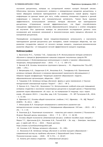 11. Фалунина Е.В. Активные методы обучения в системе высшего образования - современный взгляд на проблему обучения // Евразийский Союз Ученых. Психологические науки. - 2020. - № 4 (72). - С. 65-67.